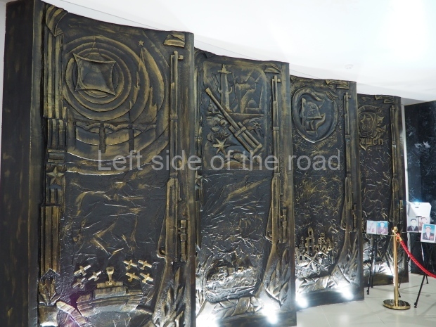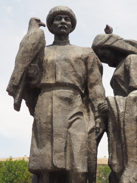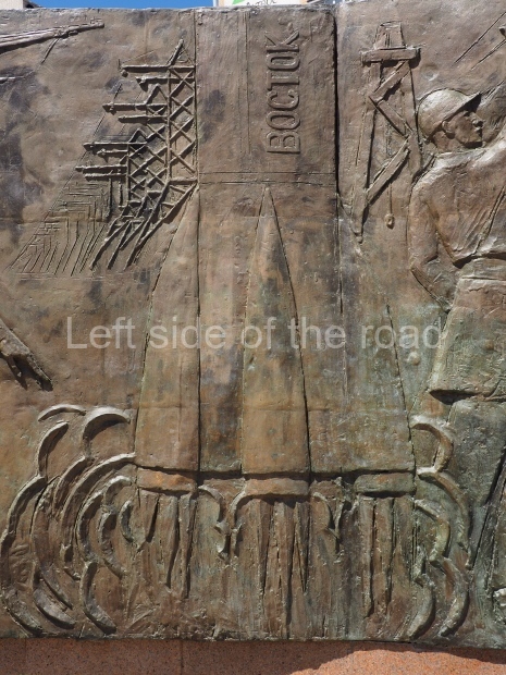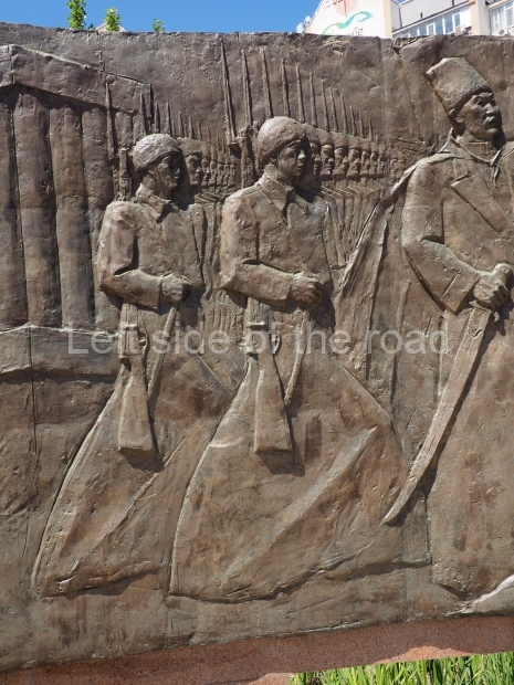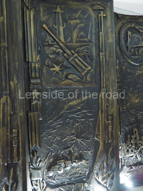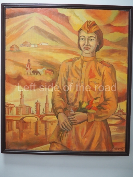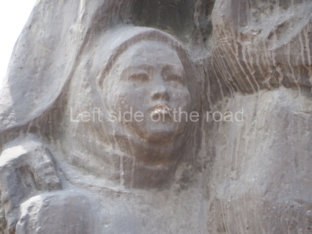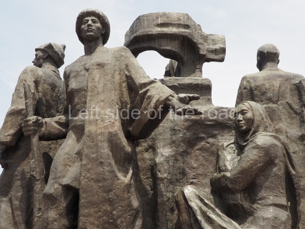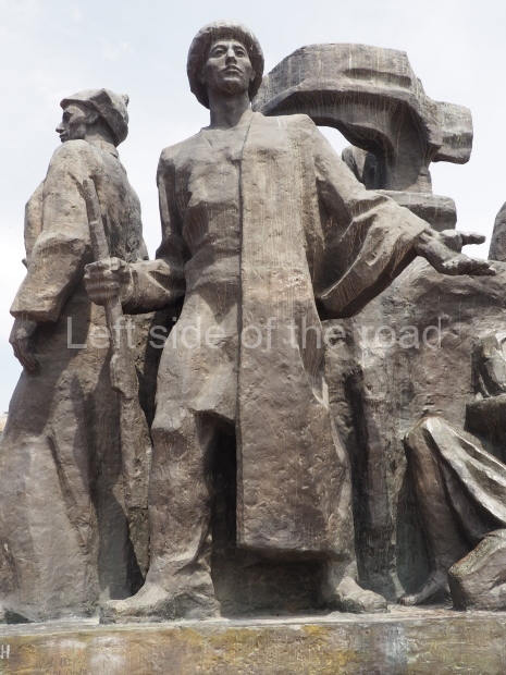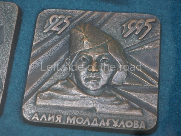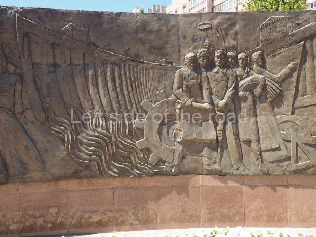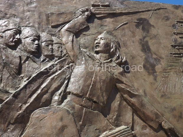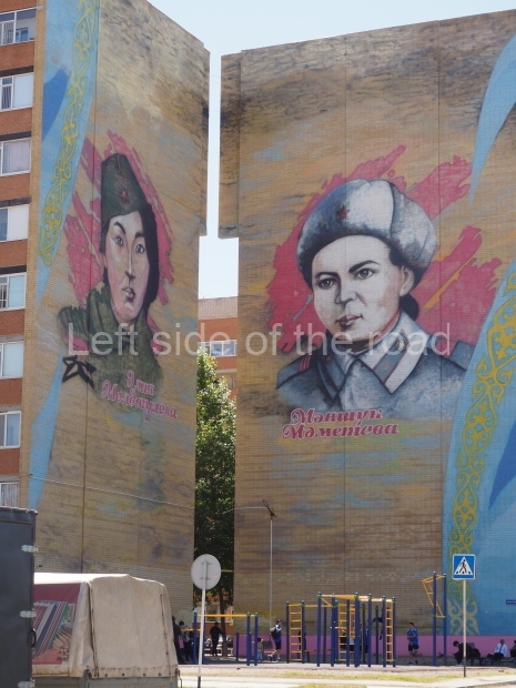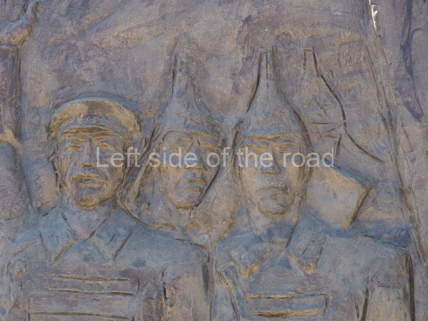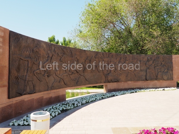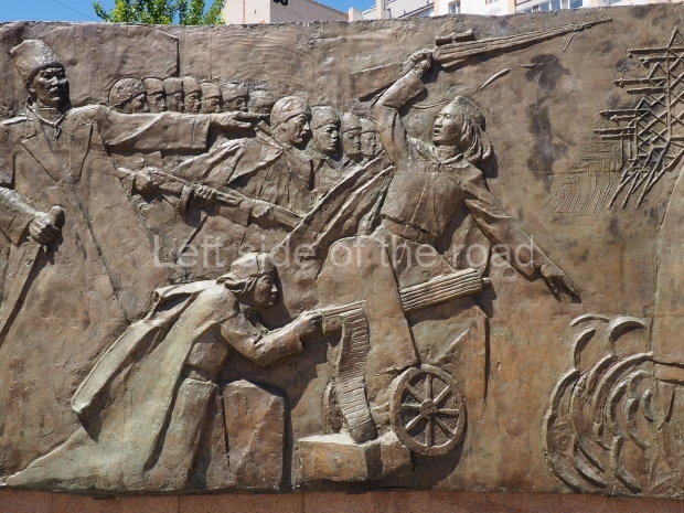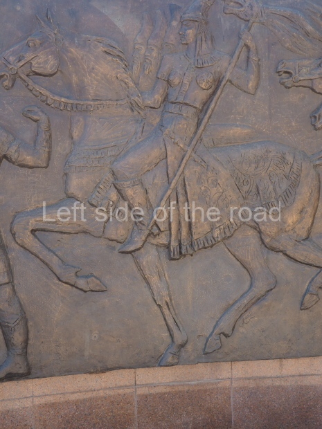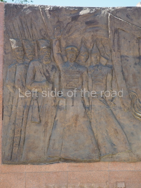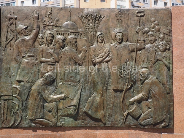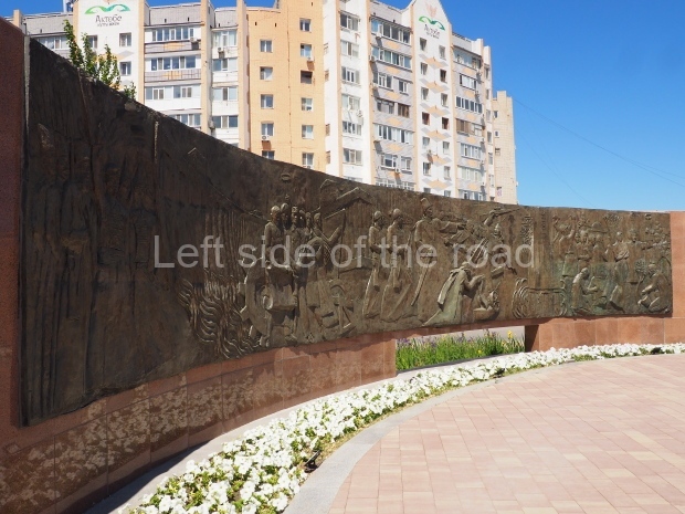 The backdrop to this complex follows very much a Soviet, Socialist Realist pattern. On the left hand side as you look at the statue, the panel represents Aktobe (and also Kazakhstan’s) past. It shows the fights for independence (against whom is not specified) including a female warrior – which sets up the scene for Aliya to be represented in the right hand panel. On this left hand side we also have the introduction of Kazakh culture in the form of a group of musicians playing traditional instruments.
