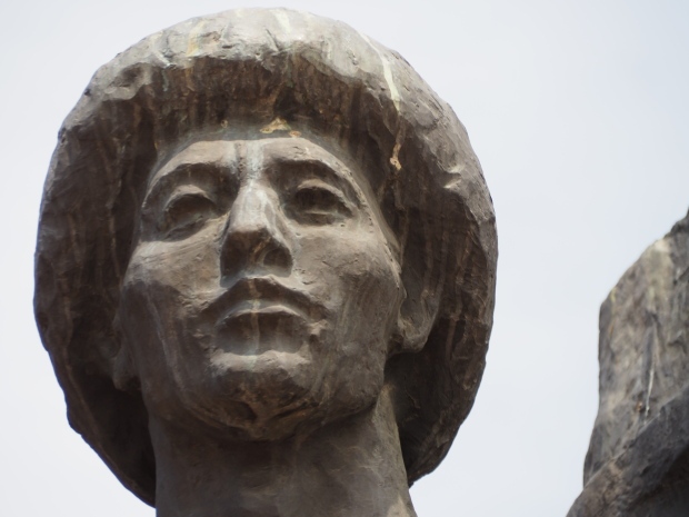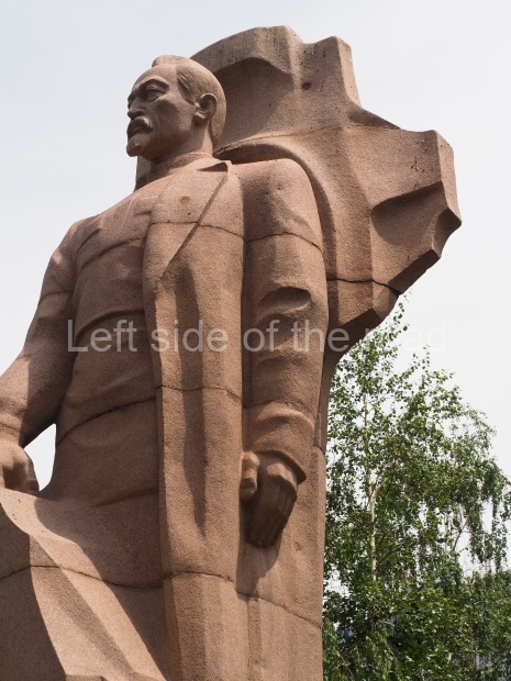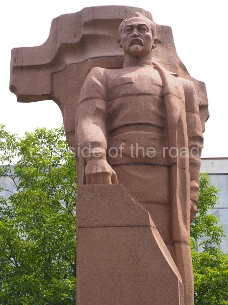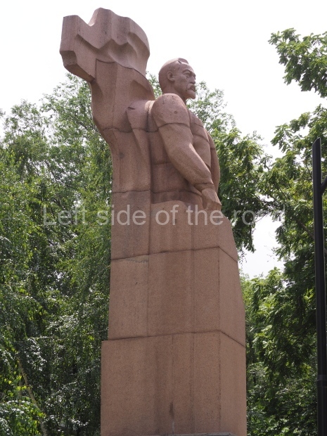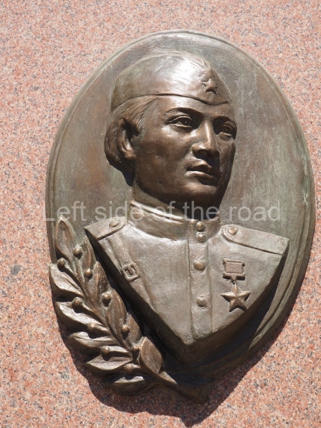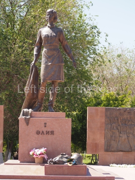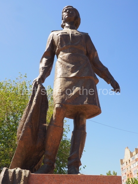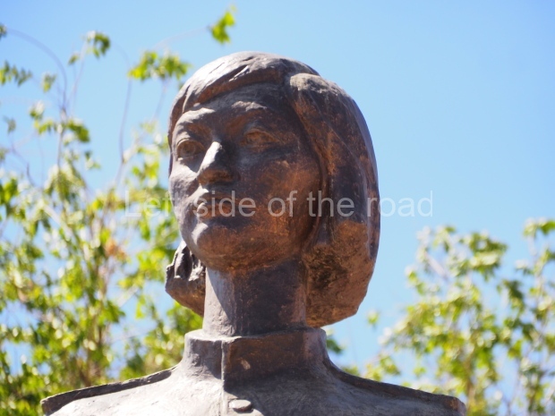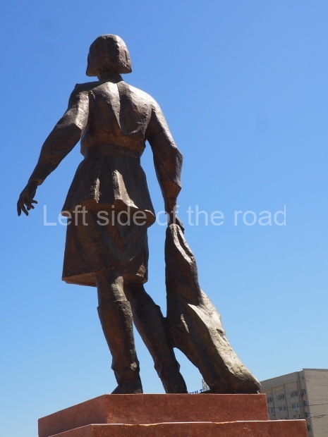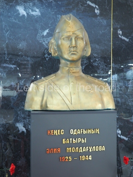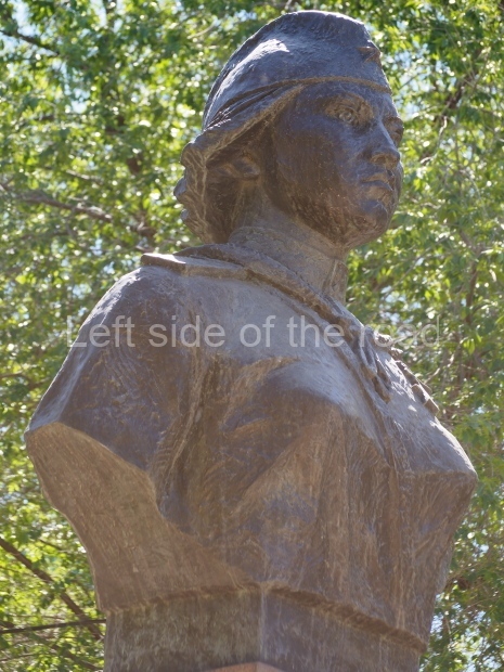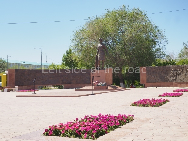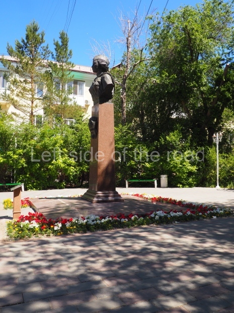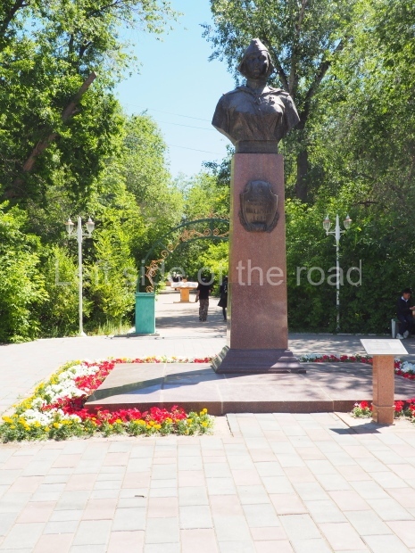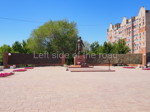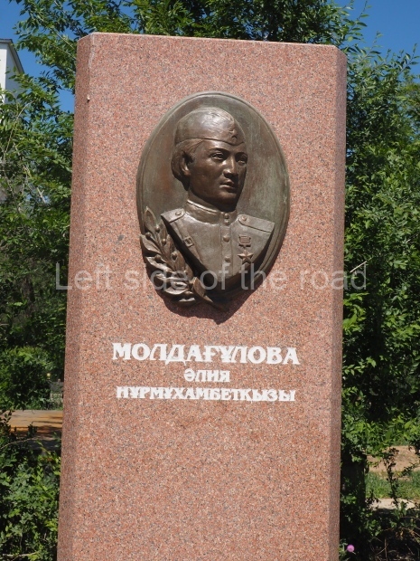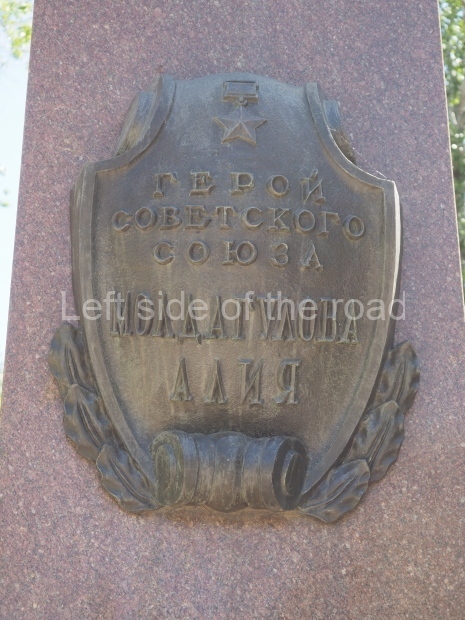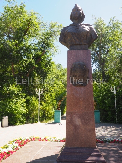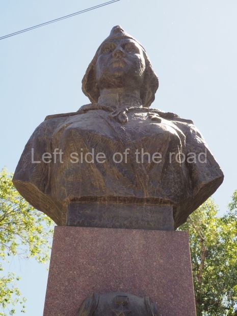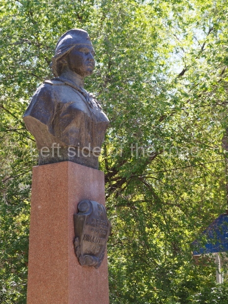 This is a much more staid and formal representation of the young woman. It is a bust, about 1.3 metres mounted on a high stone stele – giving a combined height of 3 metres. It stands at the entrance to a small green and garden space that leads off Shimize Street – opposite No 39 – in the older part of Aktobe.