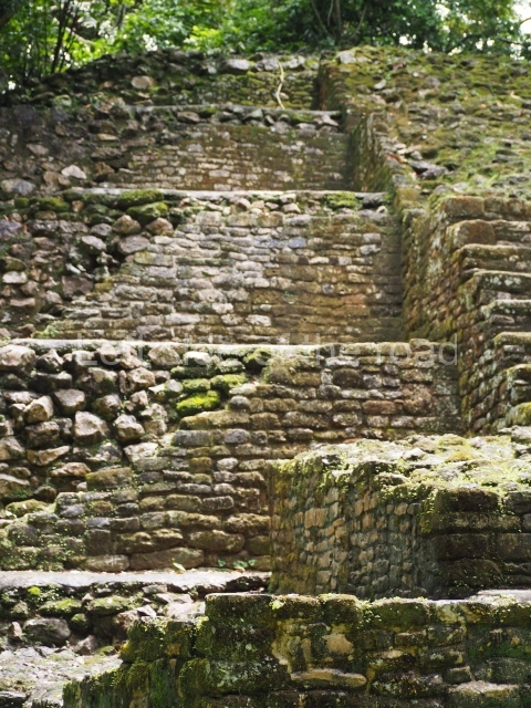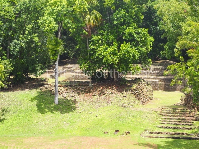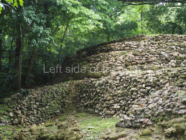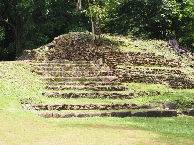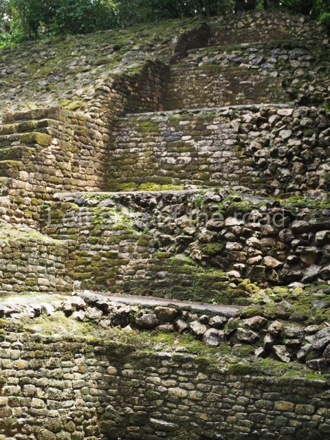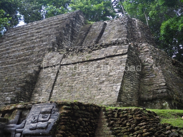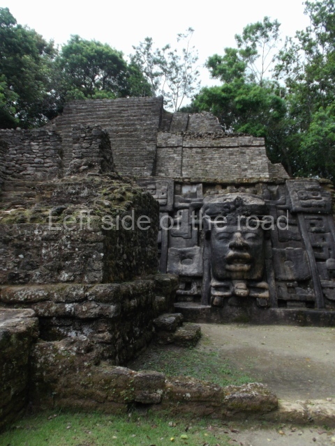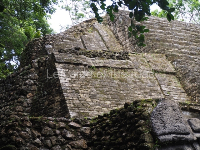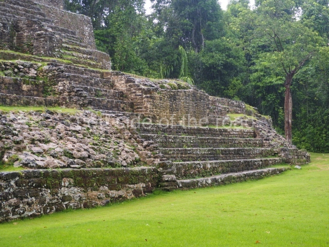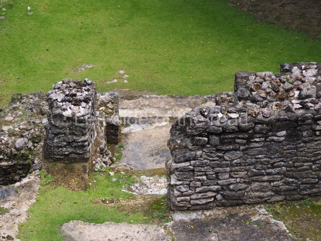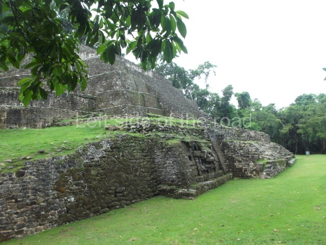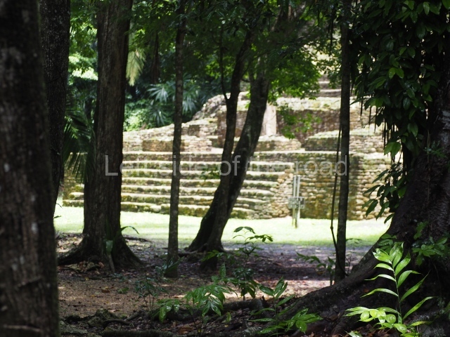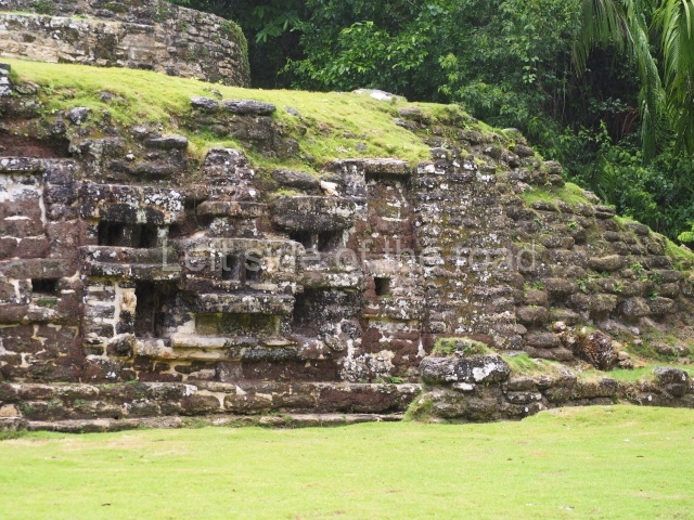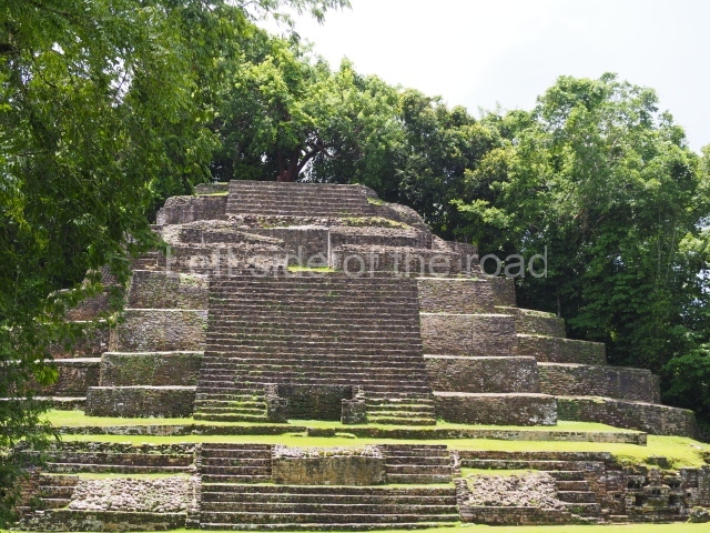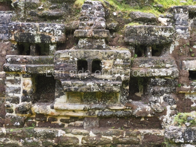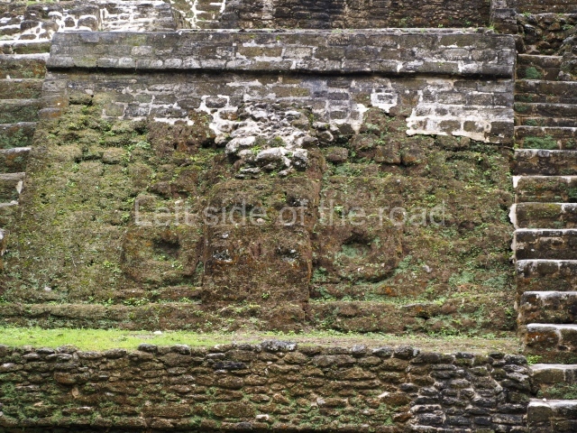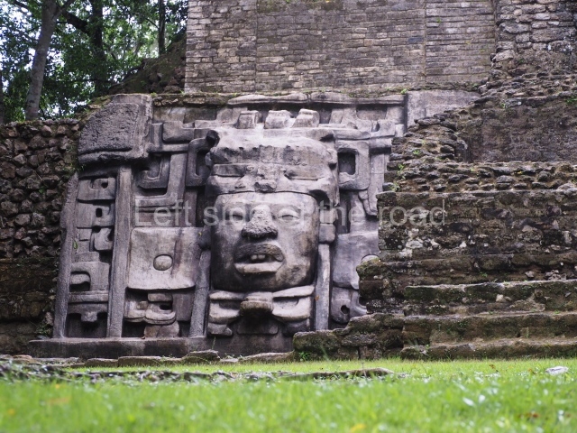 This is situated in the northern section of the site. The masks on the facade are unique in that their construction technique differs considerably from that used for other Maya masks. Instead of being modelled in stucco on a stone armature, they are made of blocks of limestone and then with a thin layer of grey stucco. Each anthropomorphic face has a headdress representing a crocodile. The presence of this symbol possibly validates the site name registered by the Spanish: Lamanay, ‘place of the crocodile’. Its construction commenced in 200 BC and it was remodelled on several occasions until AD 1300. Inside the temple is a sub-structure from the Preclassic with masks like those found in Structure 5C-2nd at Cerros. Two tombs, one of a male and the other of a female, were found inside the building. The male’s grave goods comprised objects of jade and shell, various textiles, matting and artefacts made of perishable material.