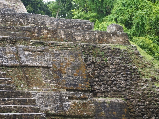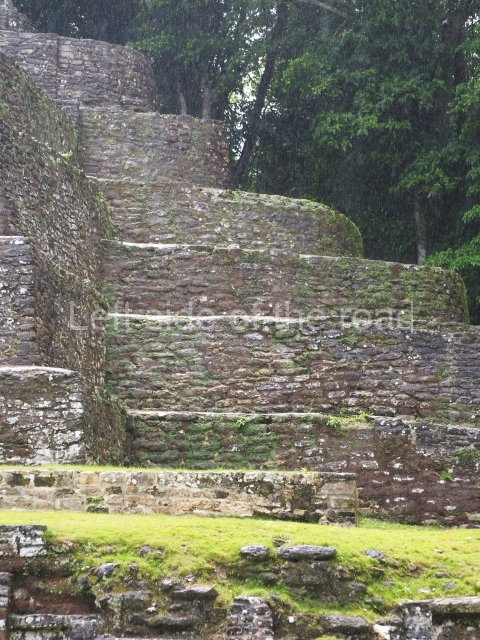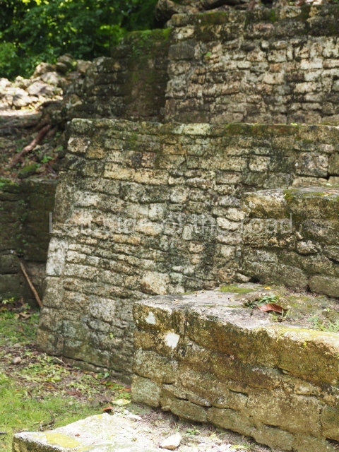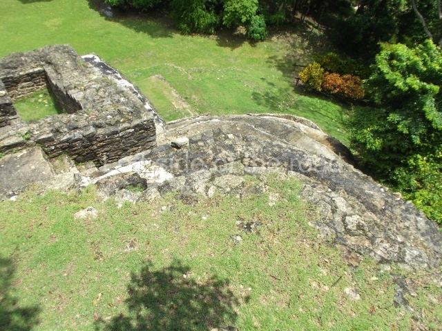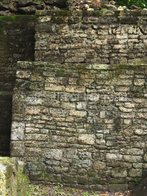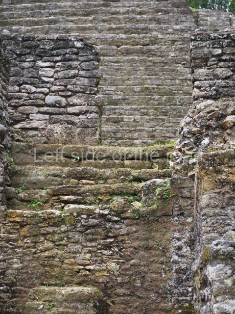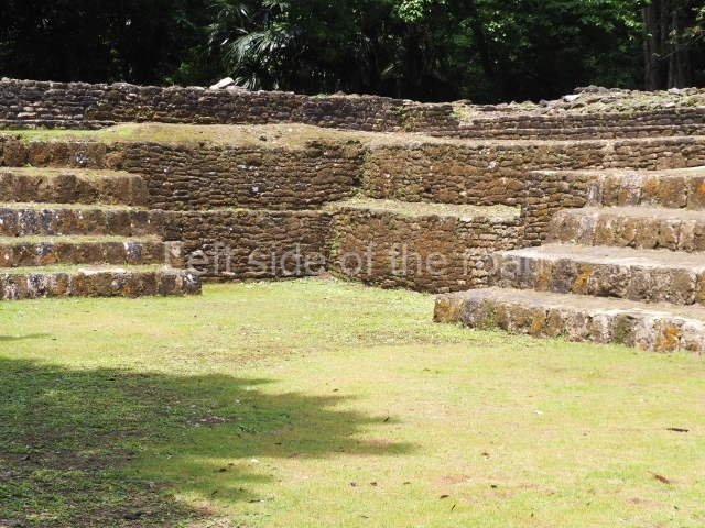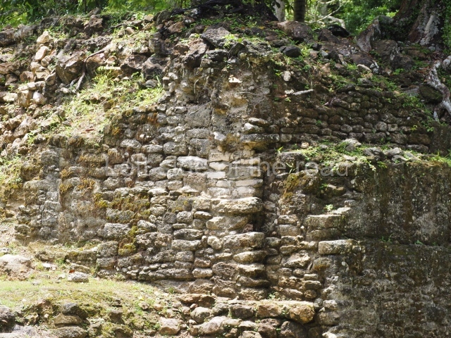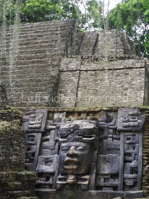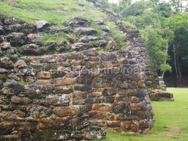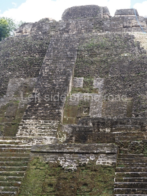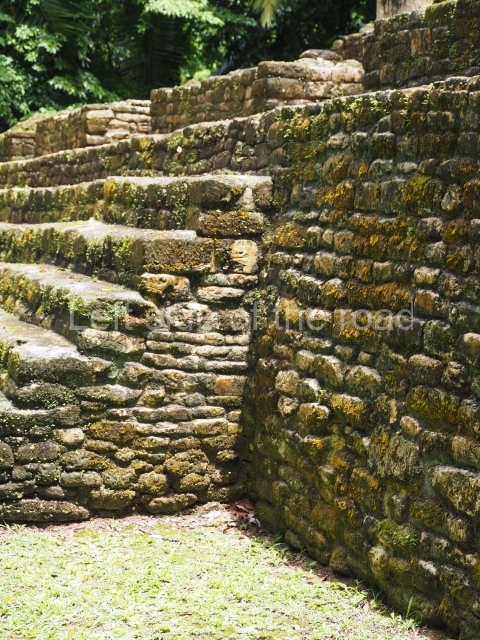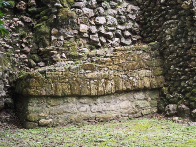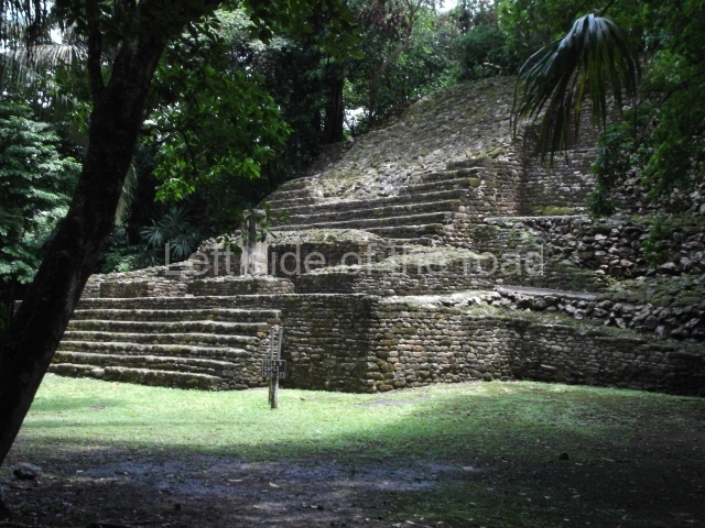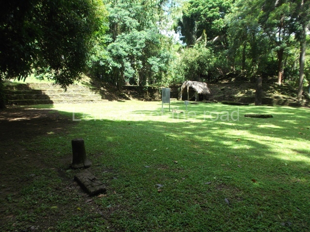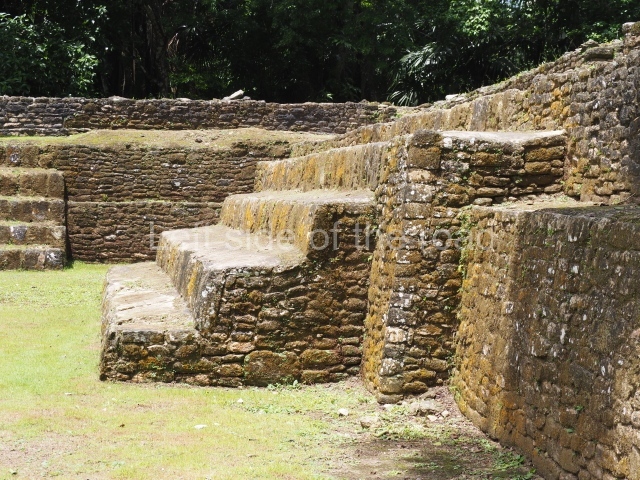 This is situated in the northern section of the site. The masks on the facade are unique in that their construction technique differs considerably from that used for other Maya masks. Instead of being modelled in stucco on a stone armature, they are made of blocks of limestone and then with a thin layer of grey stucco. Each anthropomorphic face has a headdress representing a crocodile. The presence of this symbol possibly validates the site name registered by the Spanish: Lamanay, ‘place of the crocodile’. Its construction commenced in 200 BC and it was remodelled on several occasions until AD 1300. Inside the temple is a sub-structure from the Preclassic with masks like those found in Structure 5C-2nd at Cerros. Two tombs, one of a male and the other of a female, were found inside the building. The male’s grave goods comprised objects of jade and shell, various textiles, matting and artefacts made of perishable material.