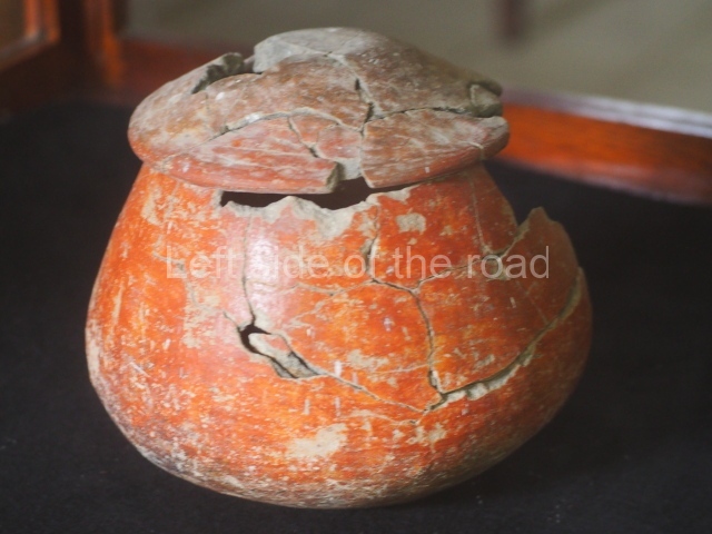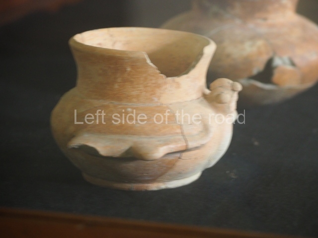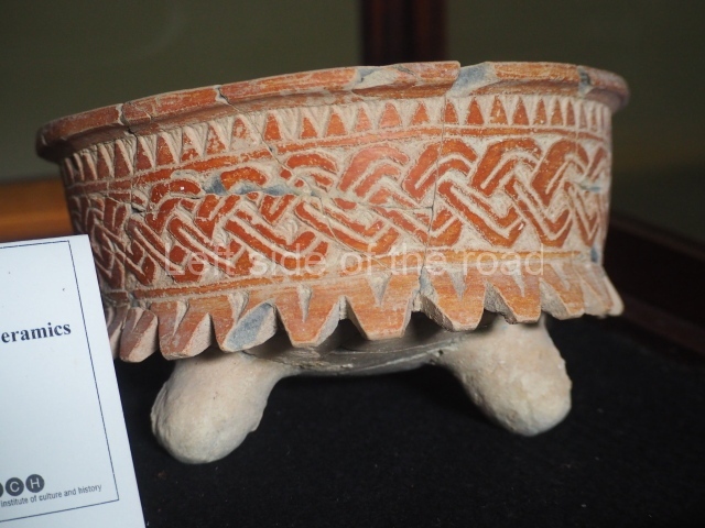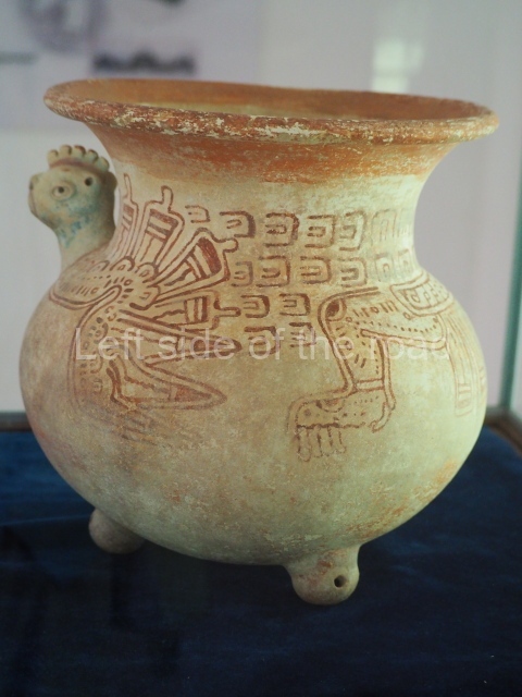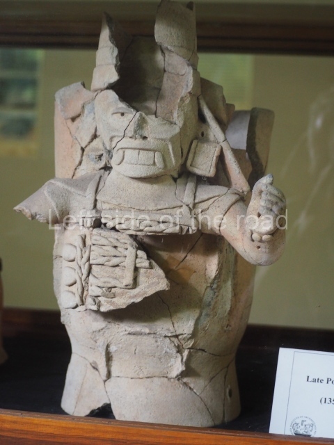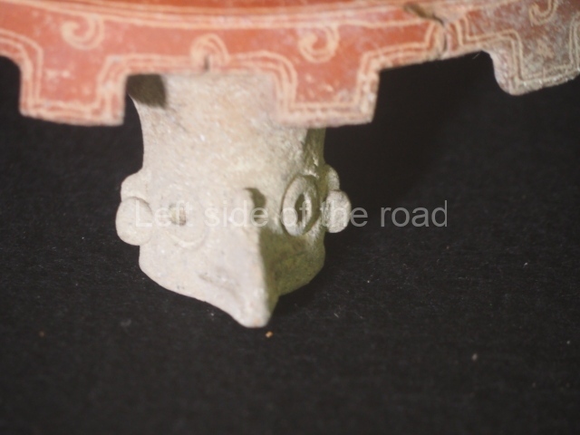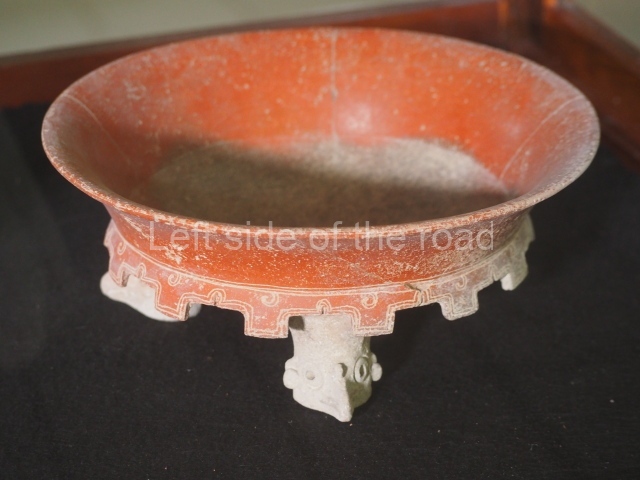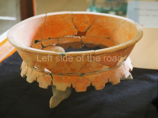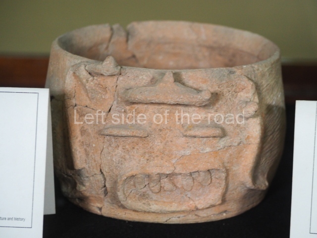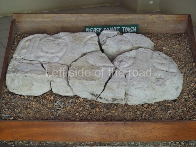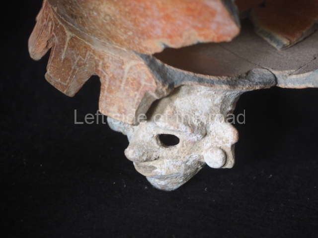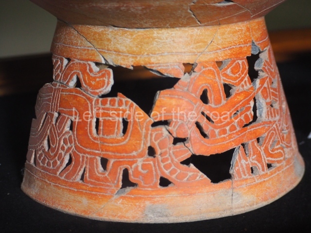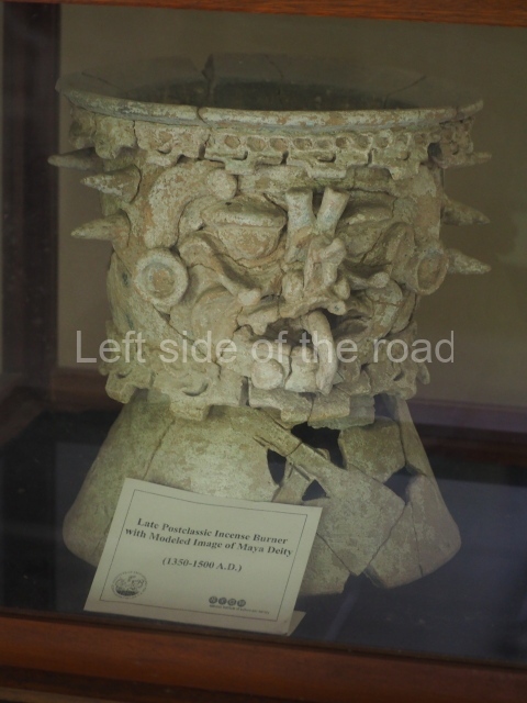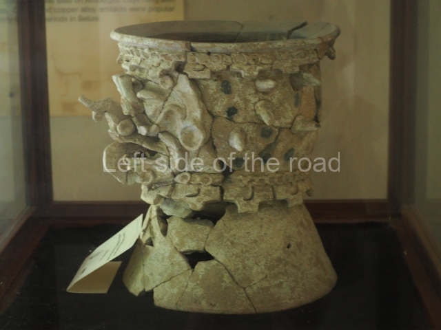 In terms of the play area, this is one of the smallest courts and yet it boasts the largest-known marker. A highly unusual offering was found below the marker: a lidded vessel containing miniature vessels and other objects, placed in a pool of mercury. This was the first time that mercury had ever been found in the Maya lowlands and the find was therefore unique. East of the court stands a small temple (N10-27) where Stela 9 was found, face down at the bottom of the temple stairway. Dating from the Late Classic, this is the only stela that was found in its original place. The figure represented is an ancestor of one of the most important Lamanai rulers, Smoking Shell. The stela commemorates the end of year (tun) 7 Ahau 3 Pop and the anniversary of Smoking Shell’s reign. The festivities to mark the occasion took place on 7 March 625 (9.9.12.0.0). The remains of five infants without any traces of violence were found at the foot of the stela. As Awe points out, this offering must have had a special significance because it is unusual to find infant burials associated with the erection of monuments. The original stela can now be found at the entrance to the site museum, which accommodates a collection of artefacts discovered during the excavations. The most outstanding pieces are the Postclassic polychrome ceramics and the eccentric flints.