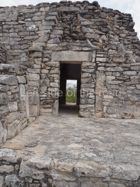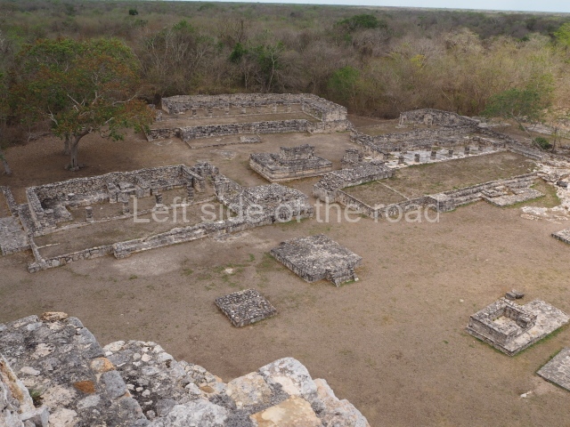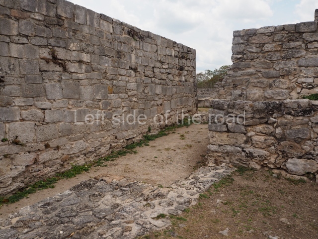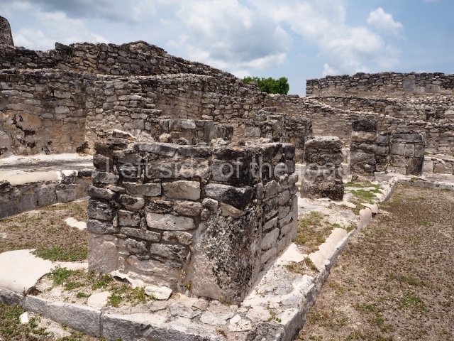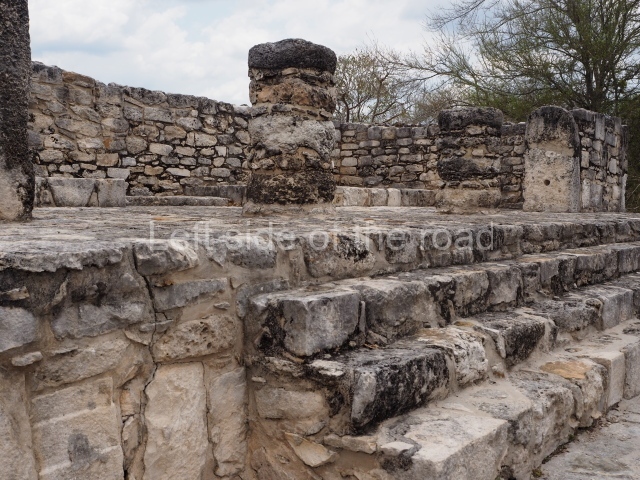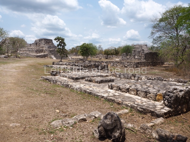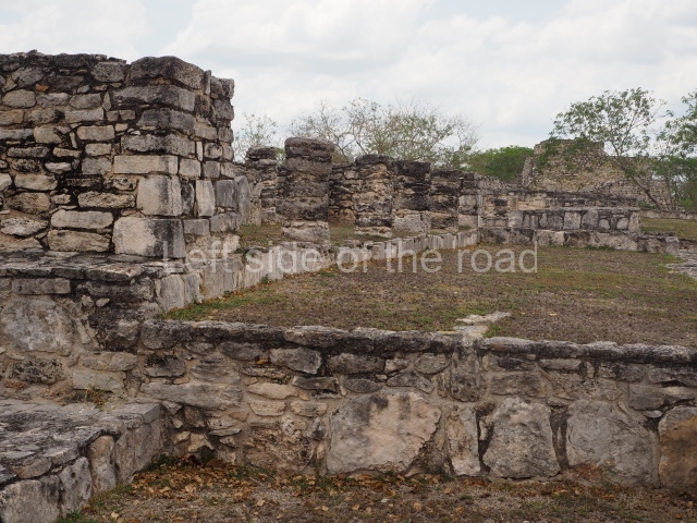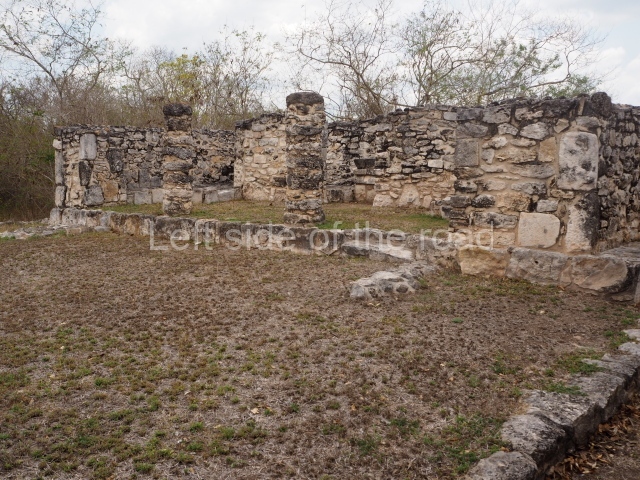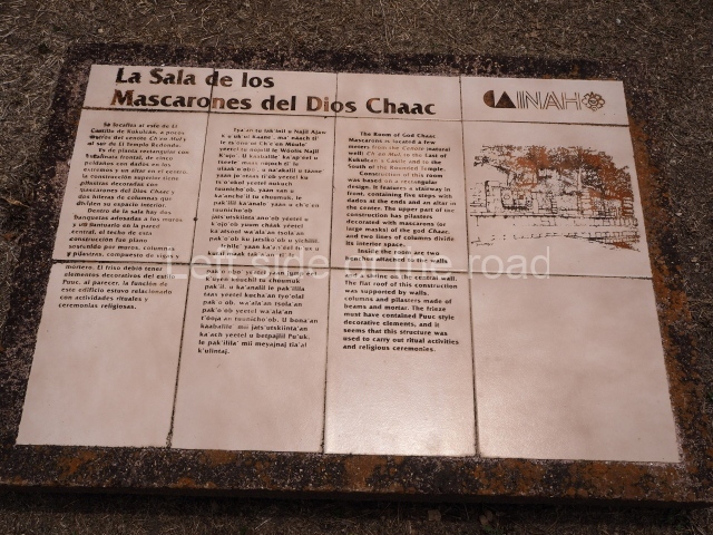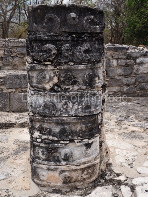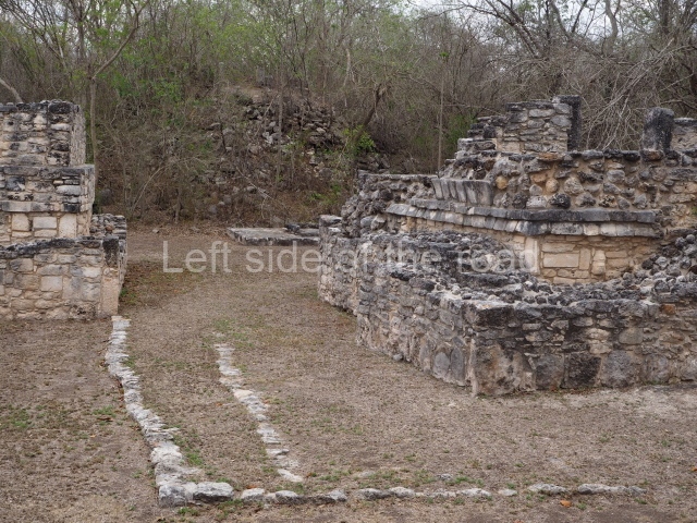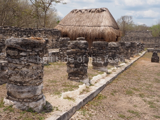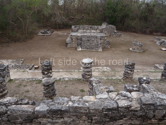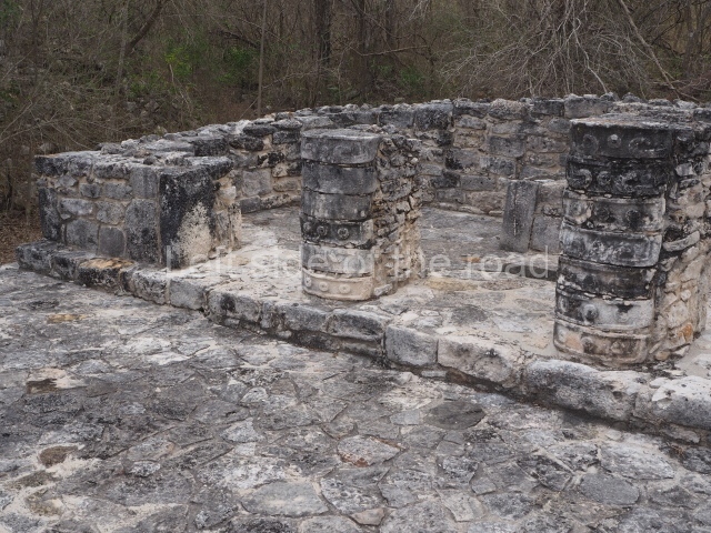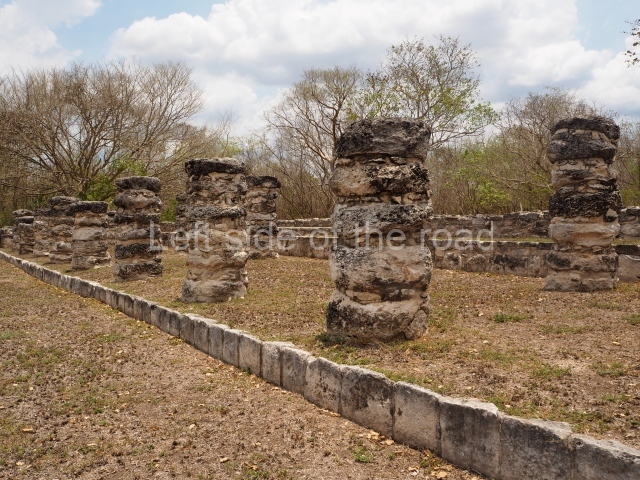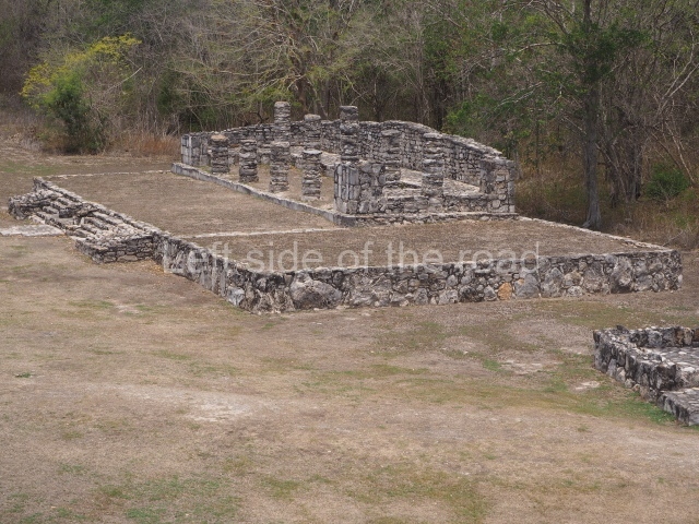 Situated south of the Round Temple, the platform has a five-step stairway with finial blocks and an altar in the middle. The hall contains pilasters decorated with masks of the god Chaac, two rows of columns, two benches abutted to the walls and a shrine in the middle.