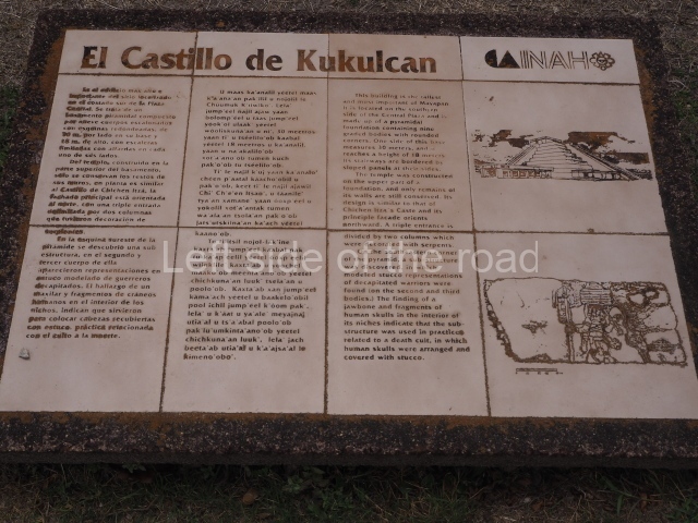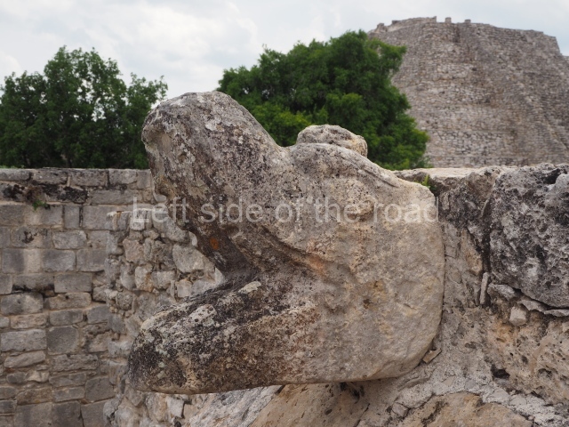 This is situated on the south side of the Central Plaza and is the highest building at Mayapan. It adopts the form of a nine-tier echeloned platform with rounded corners, measuring 30×30 m and standing 18 m high. Each side has a stairway with balustrades. Atop it is a temple with a north-facing facade, the entrance of which consists of a two-column portico once decorated with serpents. There is a sub-structure at the south-east corner of the pyramid, with representations of decapitated warriors in moulded stucco. The discovery of fragments of human skulls inside the niches of the sub-structure confirm that it was used for placing stucco-covered heads, a practice associated with death worship.