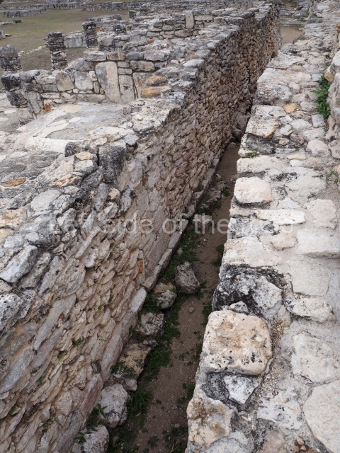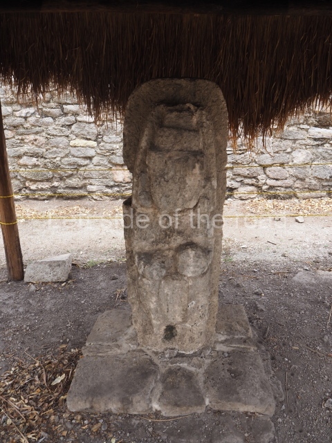 In this building the columns rise from an artificial platform at the south-west corner of the Central Plaza. There is a central wall with an intermedial entrance, a bench with moulding and pilasters at the corners. The excavations uncovered the stucco faces of the important personages that decorated the columns.
