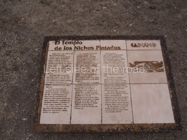 This adjoins the lower sections of the east side of the Castillo. The building has columns on three of its sides and pilasters at the north-east and south-east corners; in the middle is an L-shaped wall with a bench on the north side and an altar in the middle. There are traces of paint on the central wall. The scene consists of red and yellow marks which frame richly attired figures in profile, painted red and yellow on a blue background. The figures hold a circular banner with representations of sun disks.