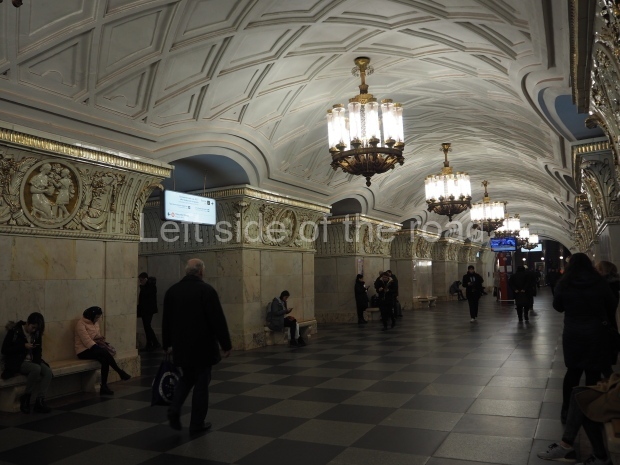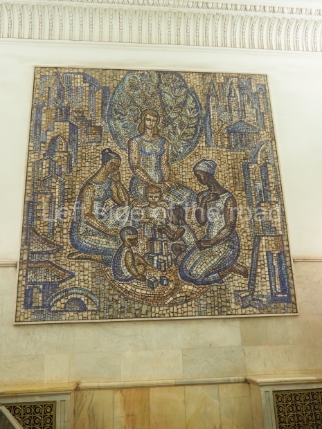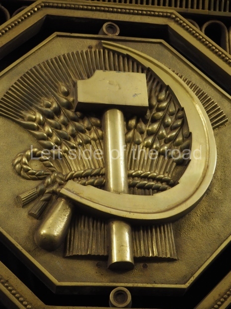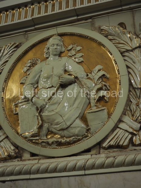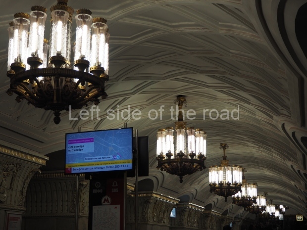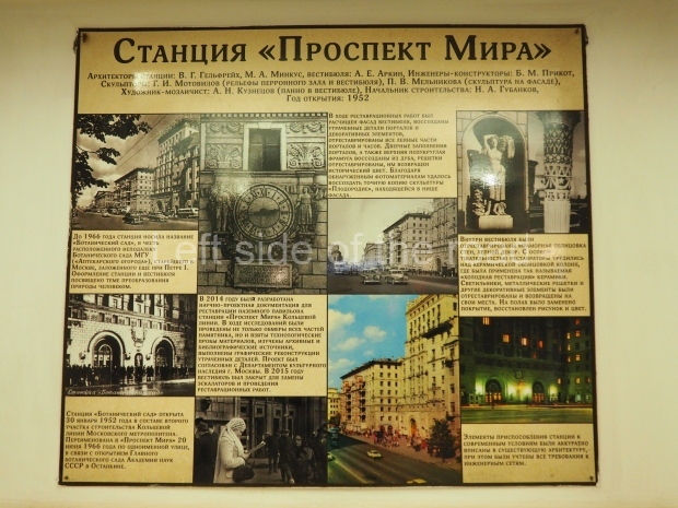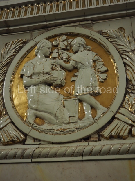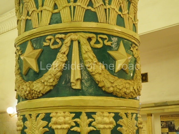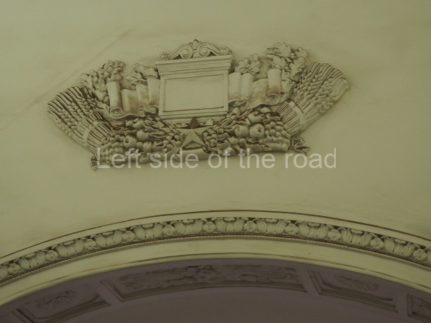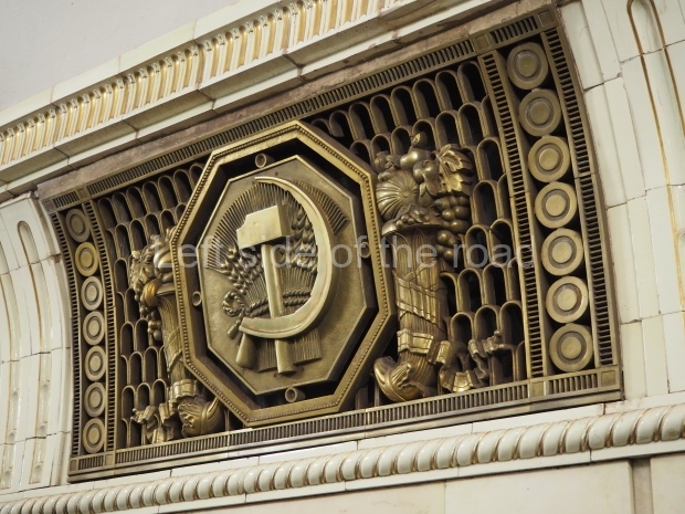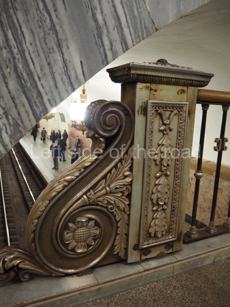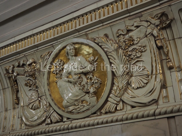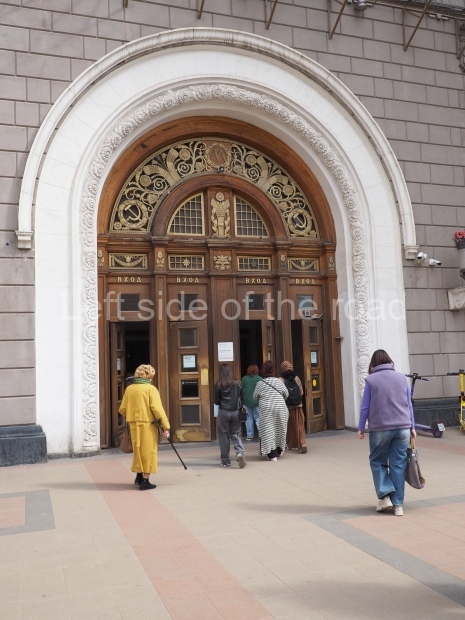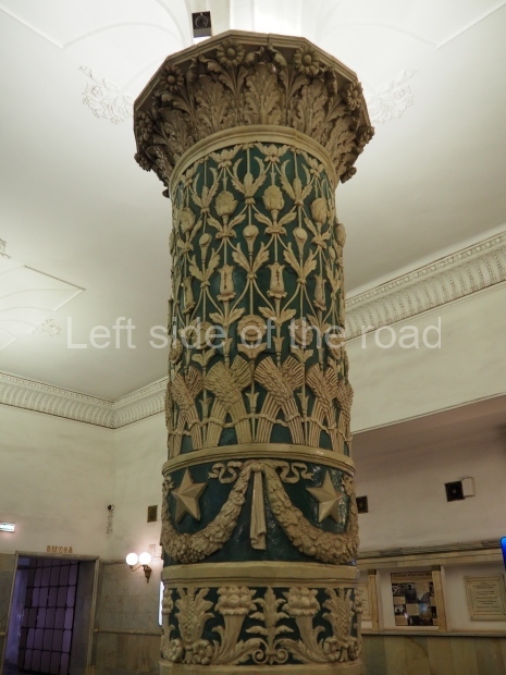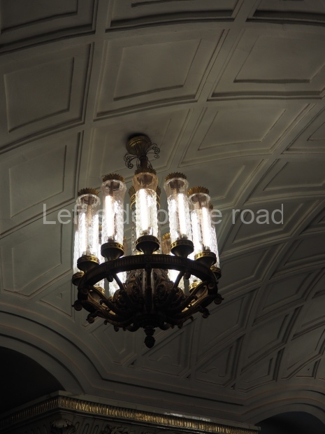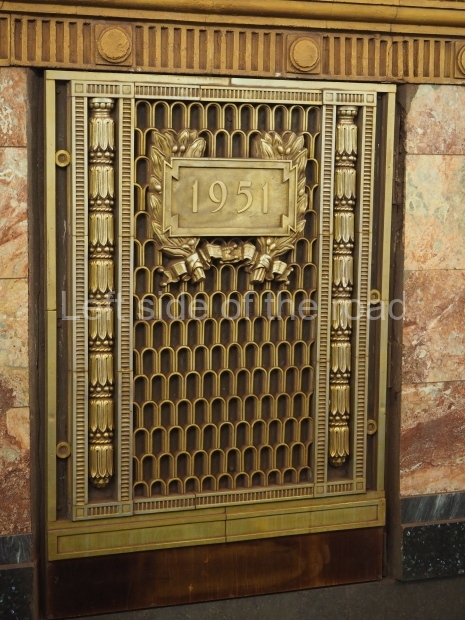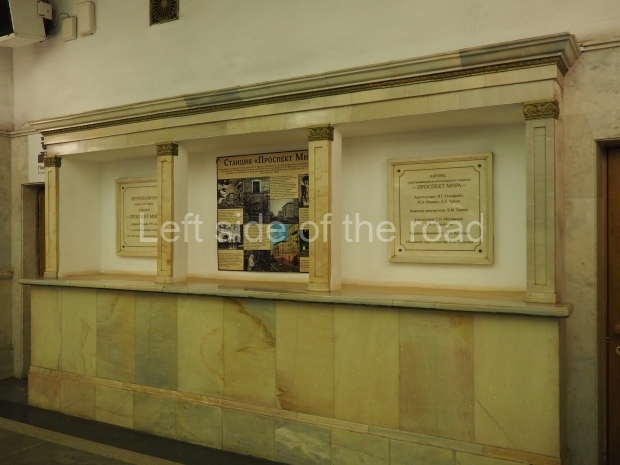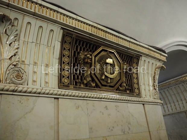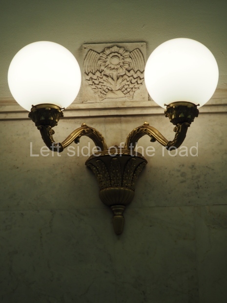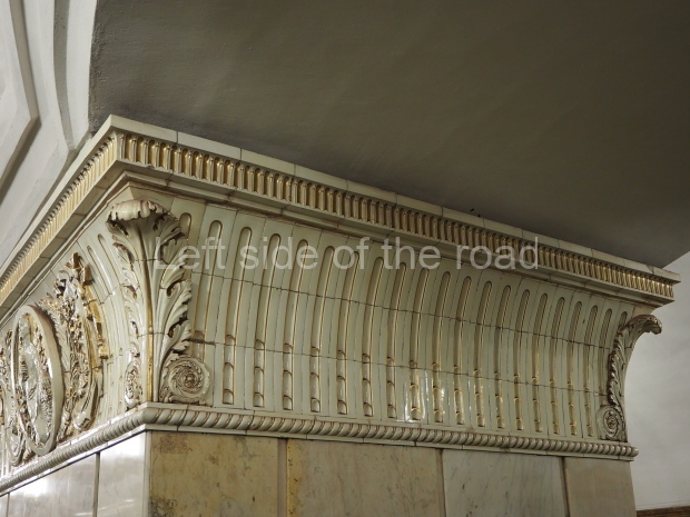 The lobby is lined with light marble. The walls, columns, friezes on the walls as well as the floors are carpeted in polished black granite. The stained glass doors, door frames, capitals and grilles are made of brass and brass-anodised aluminium. Four escalators lead from the vestibule to the underground cloakroom.