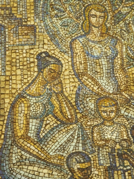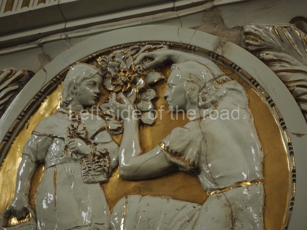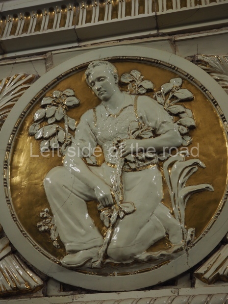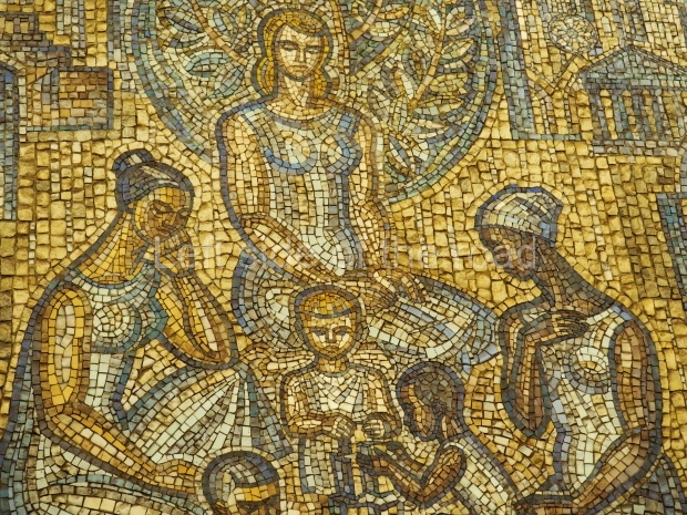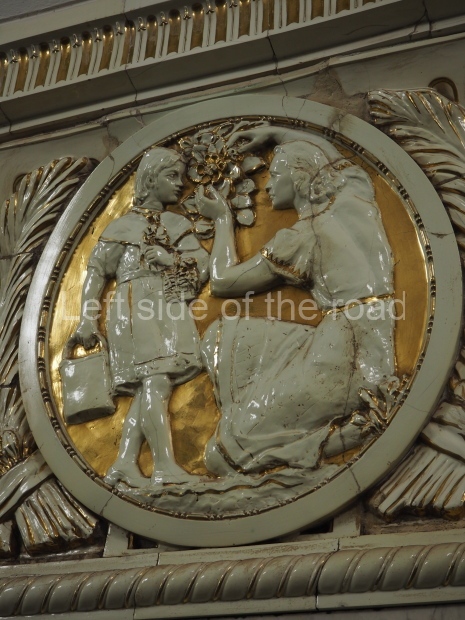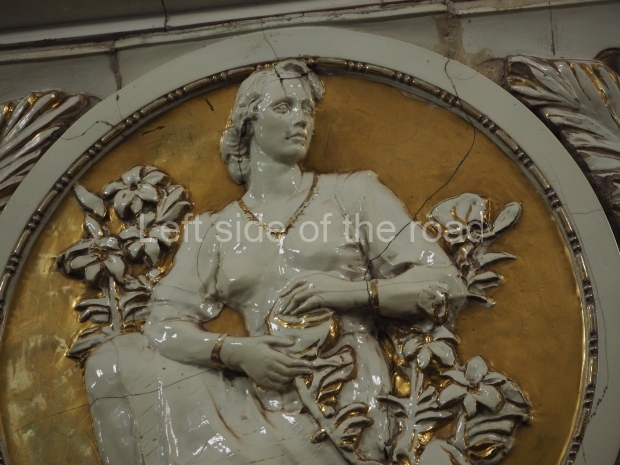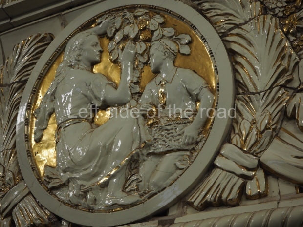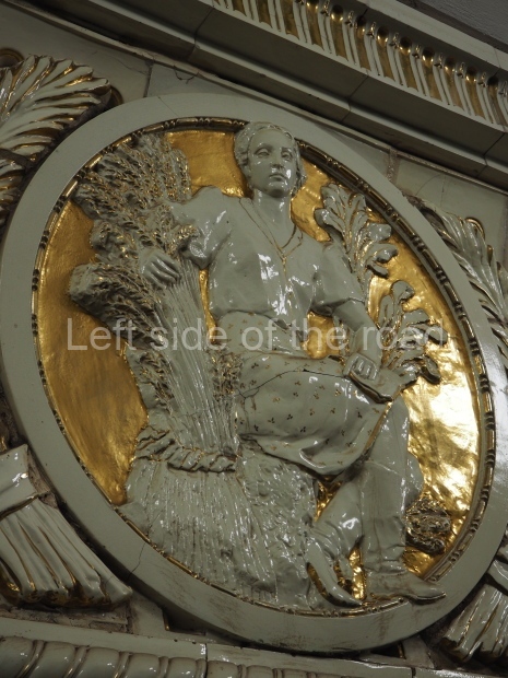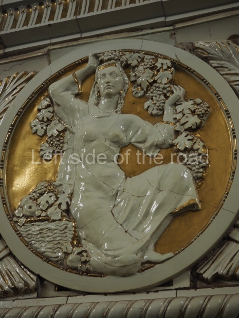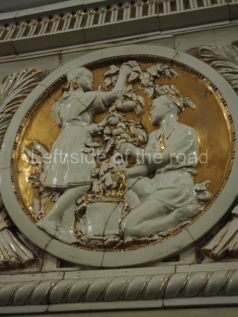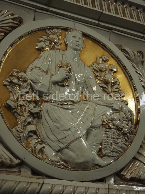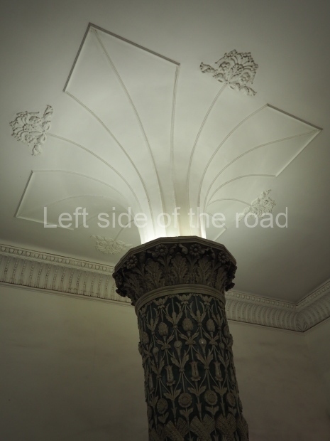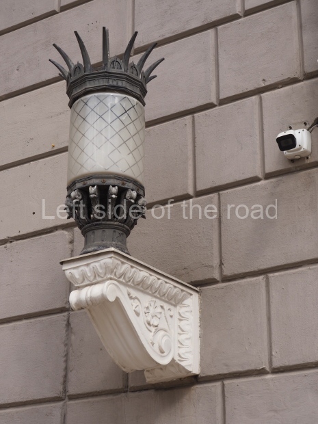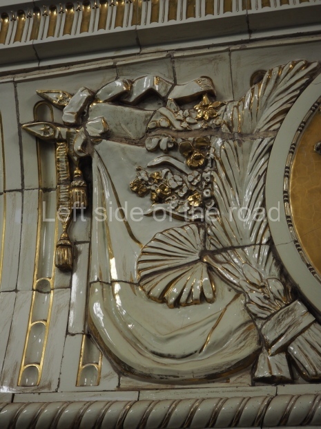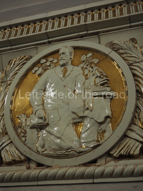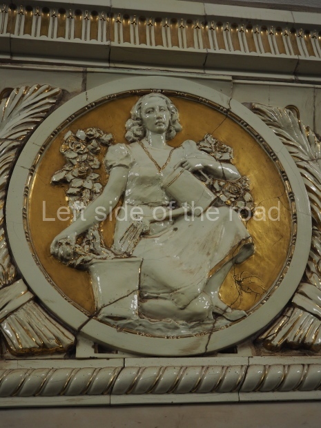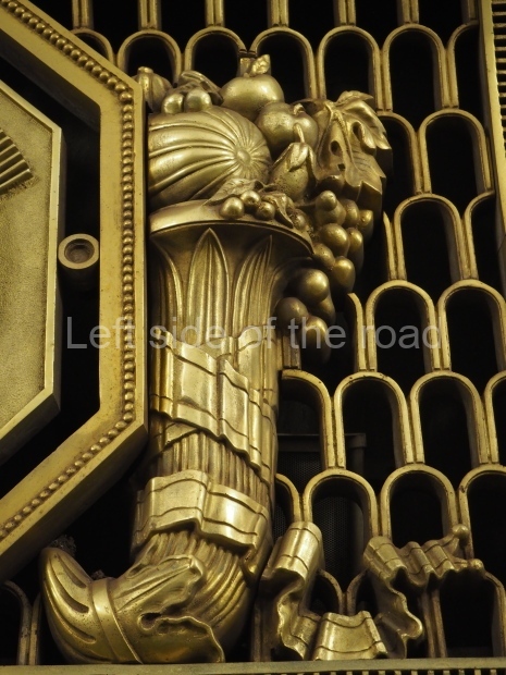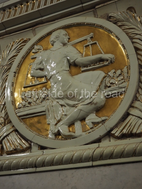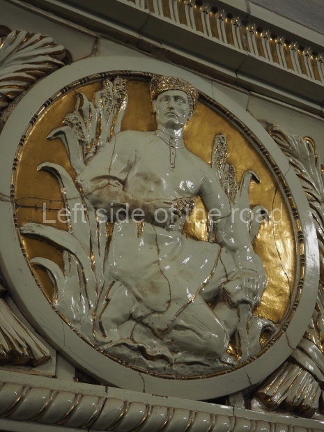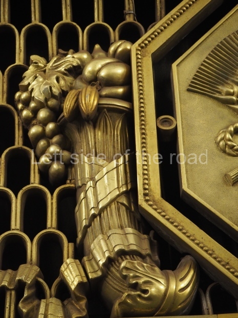 The lobby is lined with light marble. The walls, columns, friezes on the walls as well as the floors are carpeted in polished black granite. The stained glass doors, door frames, capitals and grilles are made of brass and brass-anodised aluminium. Four escalators lead from the vestibule to the underground cloakroom.