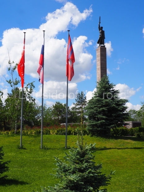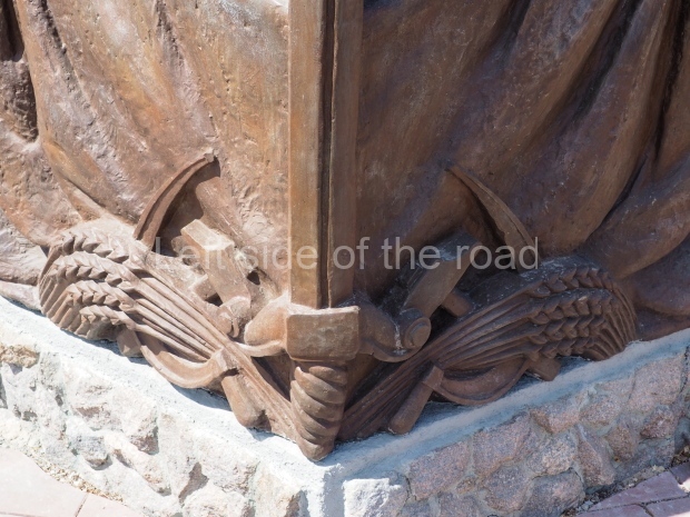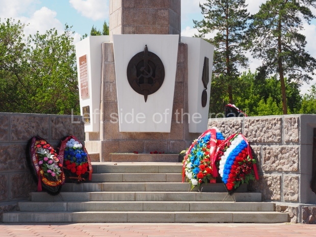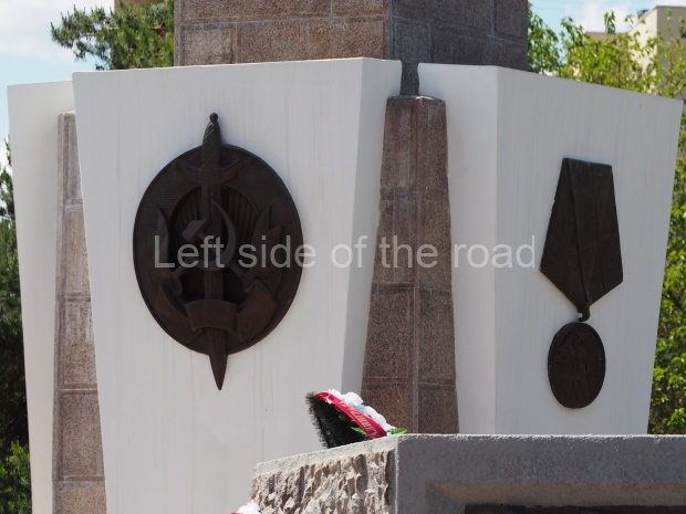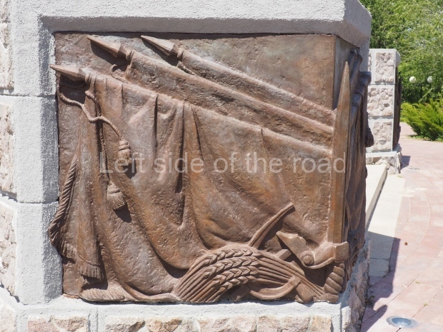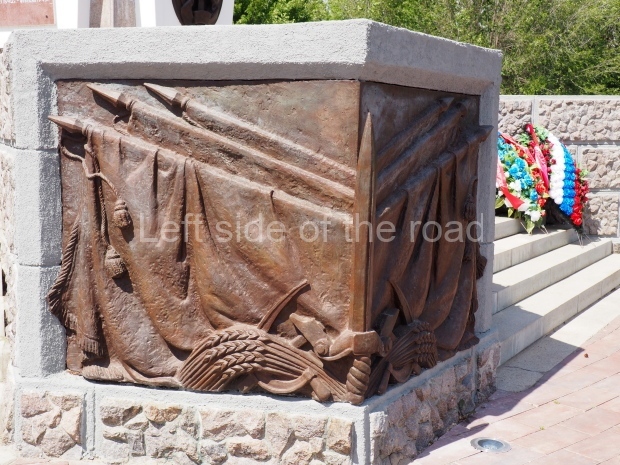The platform upon which all this stands has five sets of steps up to the pentagon. On two sides of the wall that flanks these steps are mirrored images of; three Soviet flags lowered as a sign of respect for the fallen, the Hammer and Sickle over which lies a sheaf of wheat and the corner is formed by a vertical sword, point at the top (similar to that in the hand of the NKVD soldier at the top of the column).