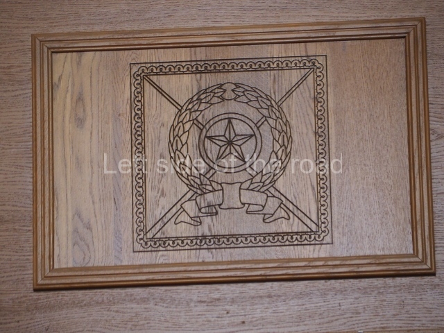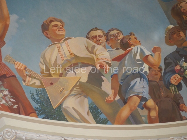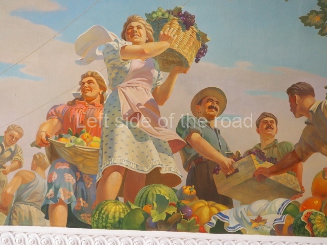 The rectangular panel depicts a bucolic scene of workers on a State/collective farm in the area. Here note the presence of the electricity pylon commemorating the achievement of the electrification of the whole country, a challenge Lenin posed to the country in declarations in the early 1920s.