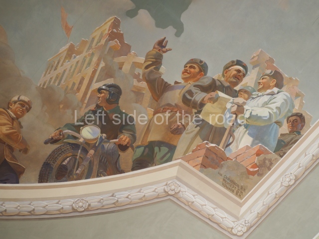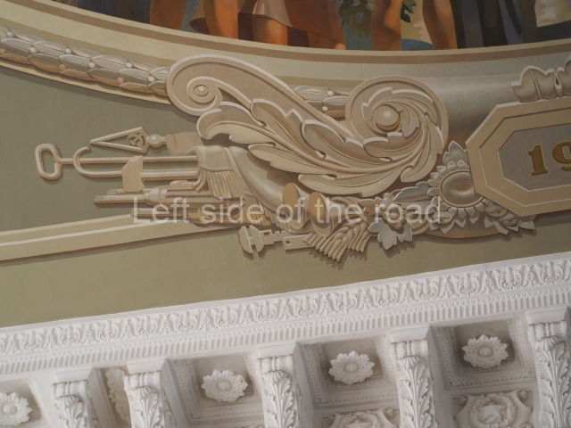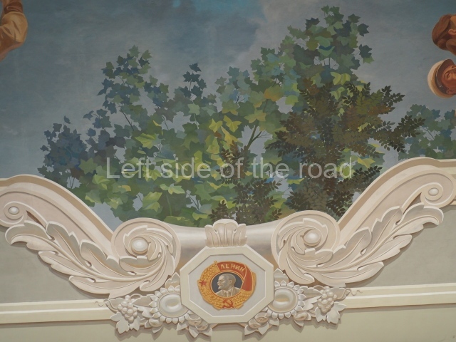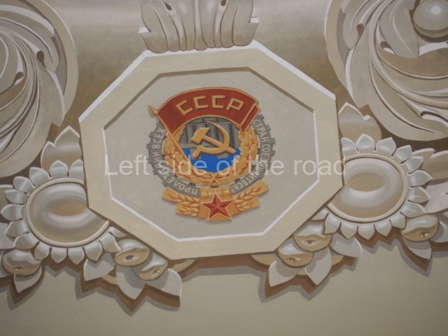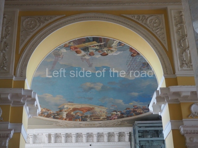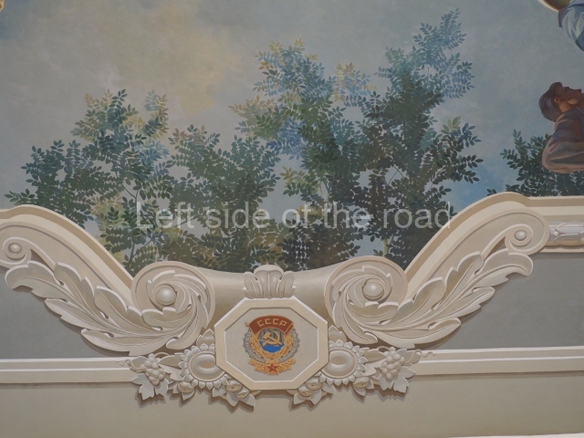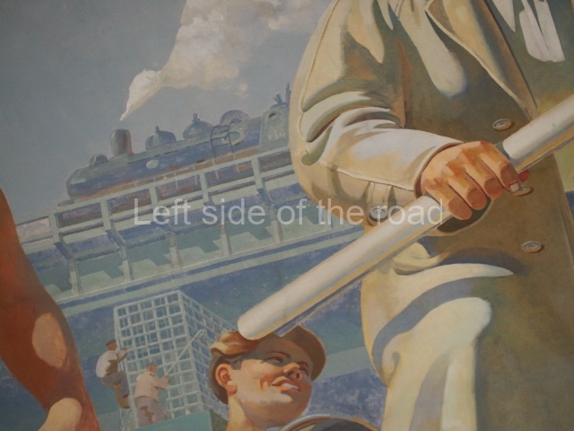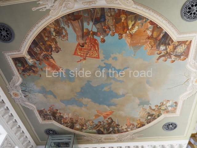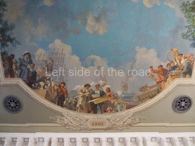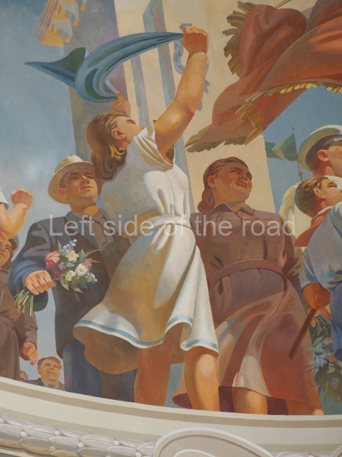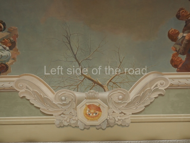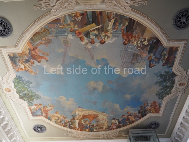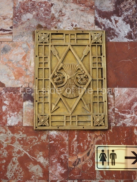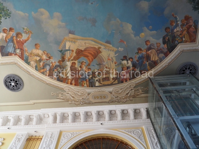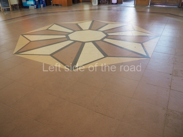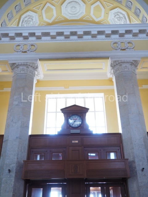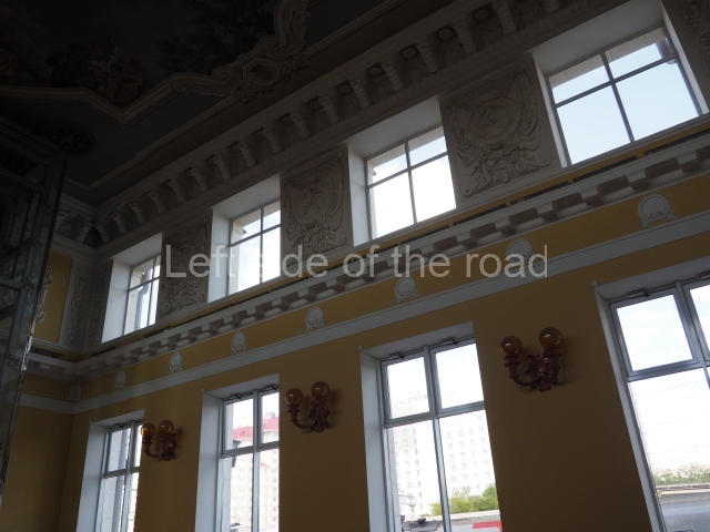 There are three of these ceiling panels – one circular over the ticket hall, another circular over the seated waiting area and the third is rectangular in a large room off the ticket hall that used to be a cafe but which is now a VIP/1st Class lounge – which no one seems to use. However, when I asked to take pictures of that ceiling panel, and the room itself, there was no problem.
