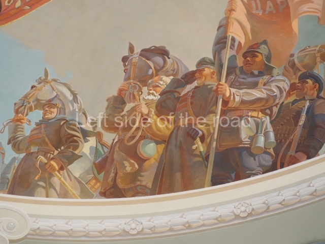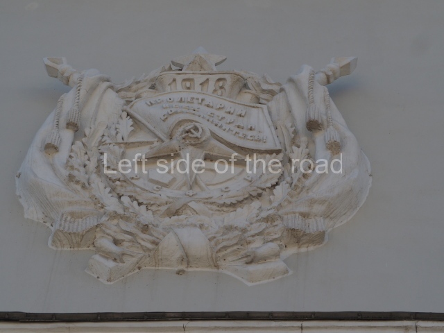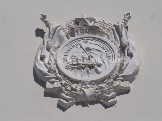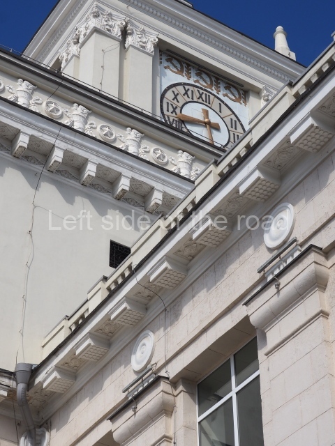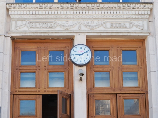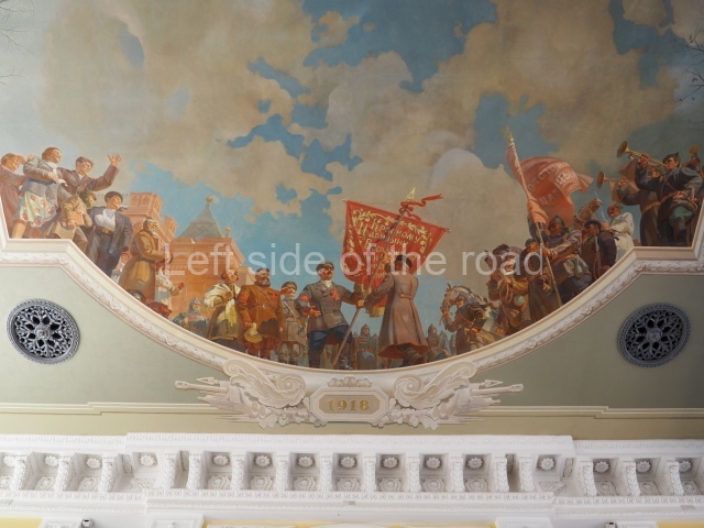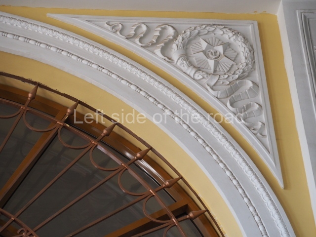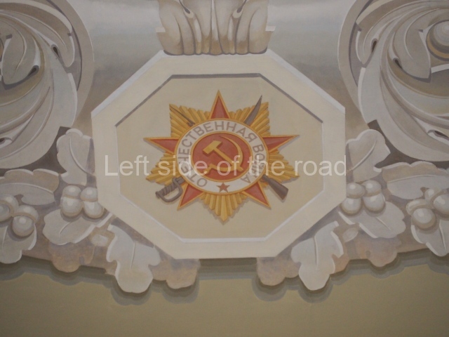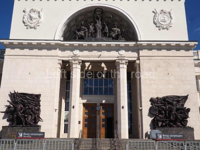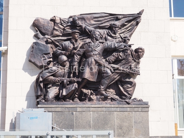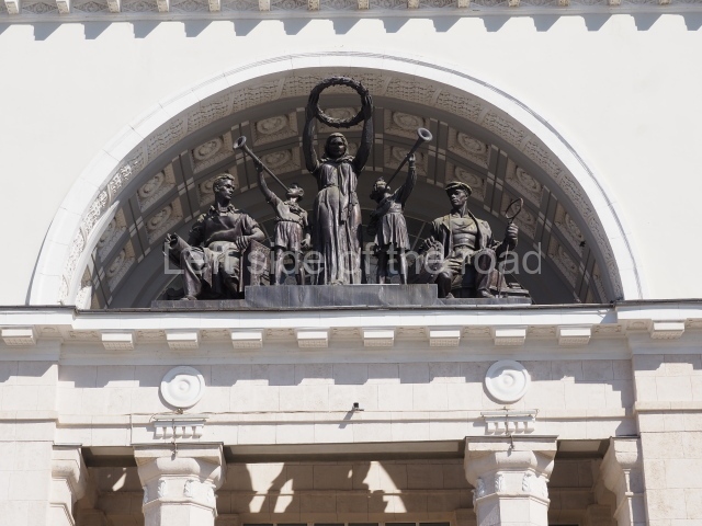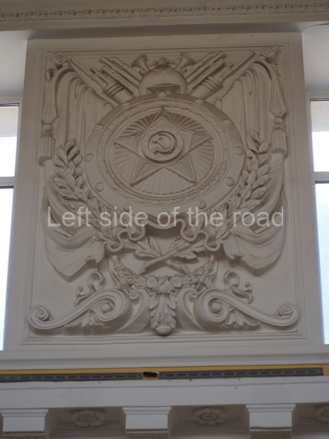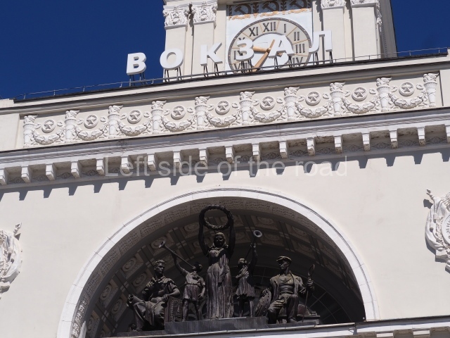 On either side of the main entrance to the station, under the tower and clock, are bas reliefs that depict, on the left, a representation of the Civil War and on the right the Siege of Stalingrad in the Great Patriotic War. Note the Nazi standard being trampled underfoot in the second bas relief.