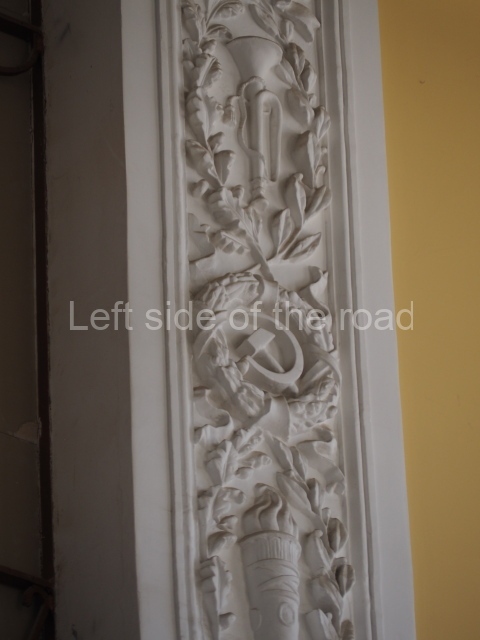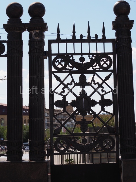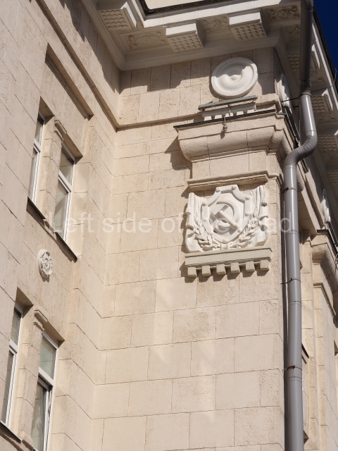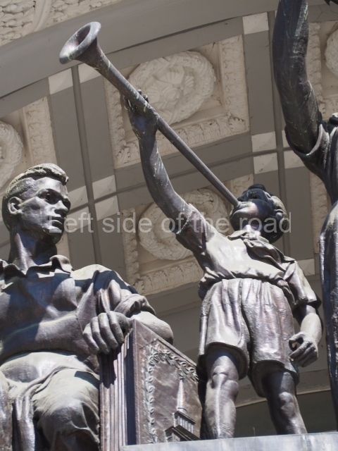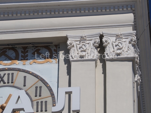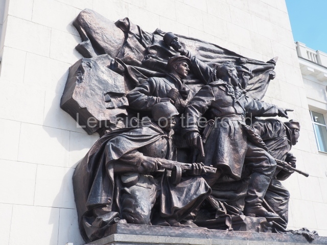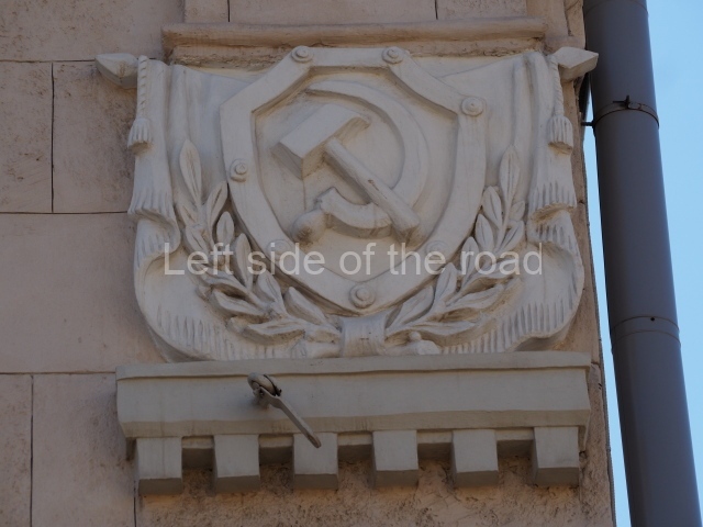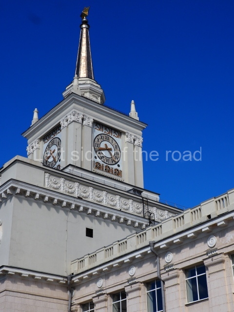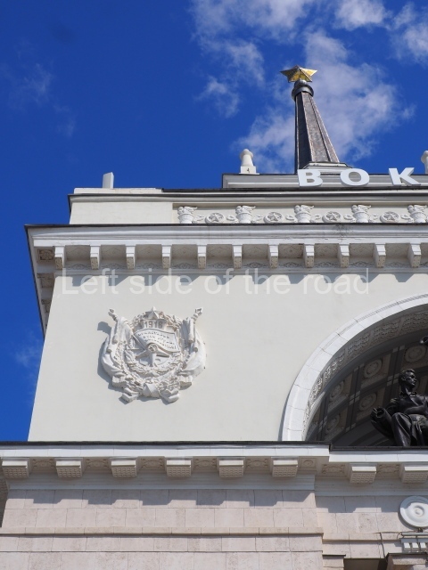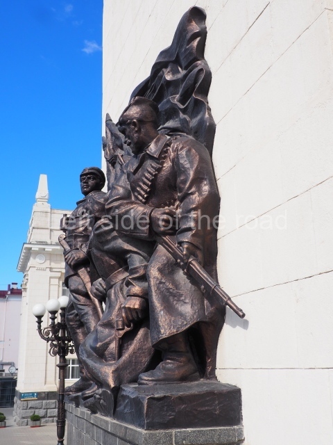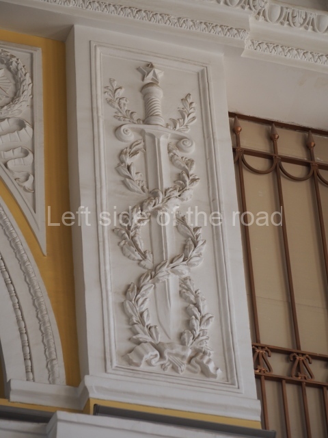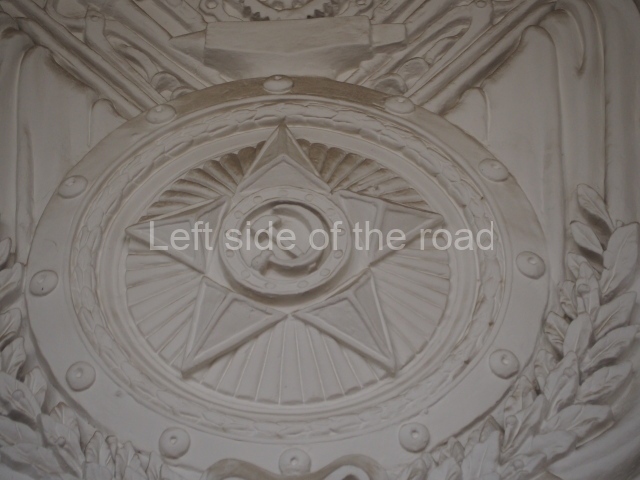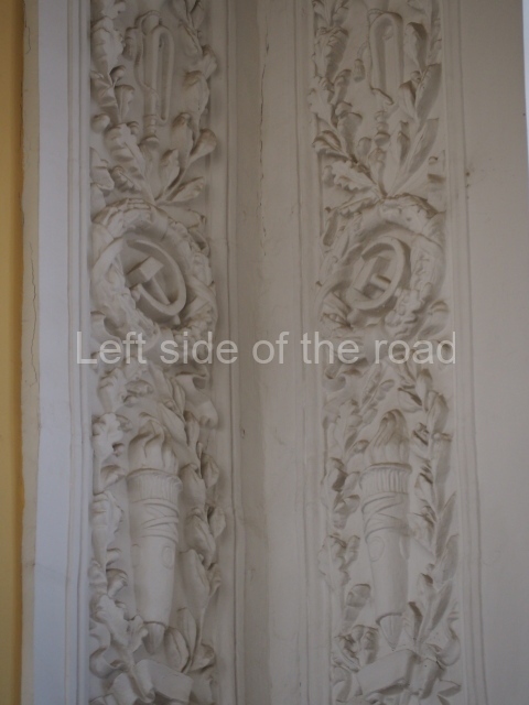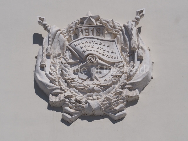 On either side of the main entrance to the station, under the tower and clock, are bas reliefs that depict, on the left, a representation of the Civil War and on the right the Siege of Stalingrad in the Great Patriotic War. Note the Nazi standard being trampled underfoot in the second bas relief.