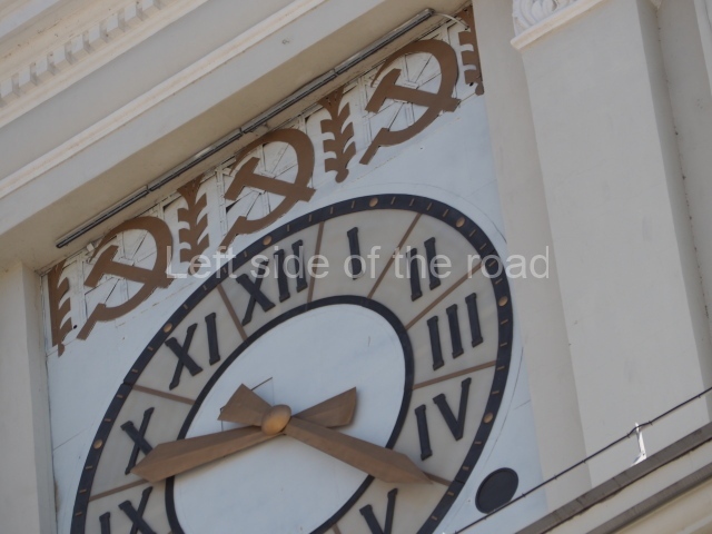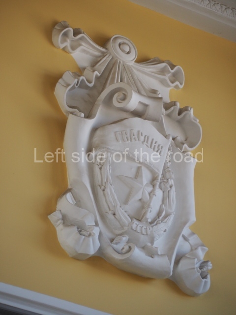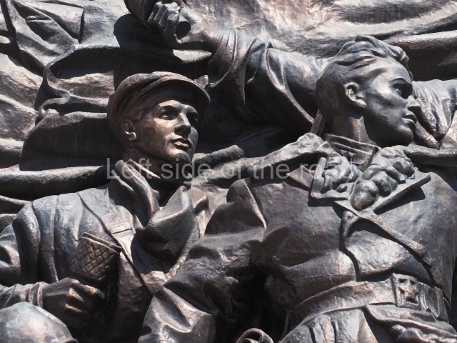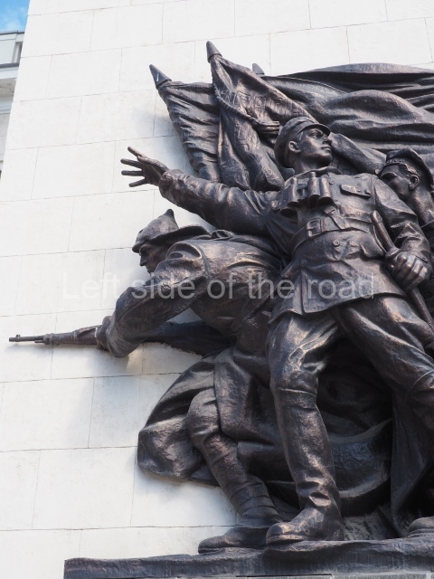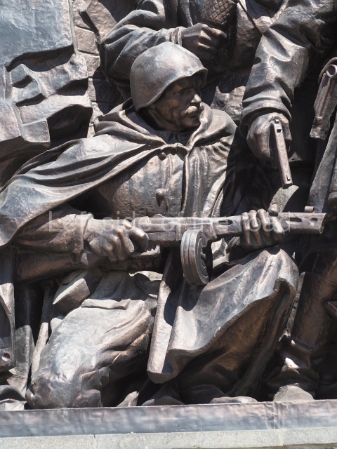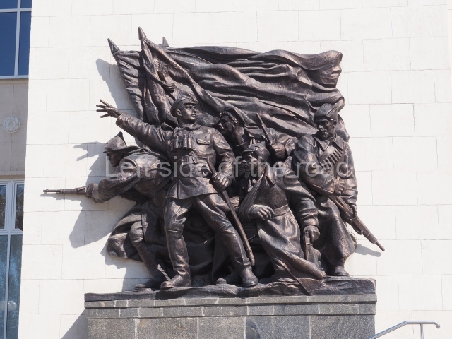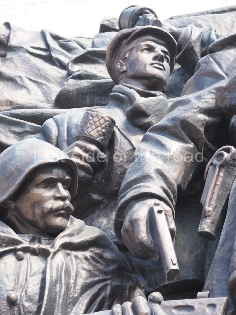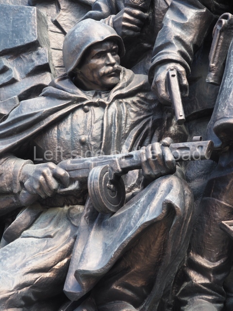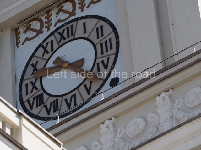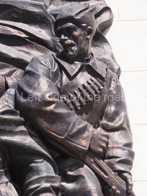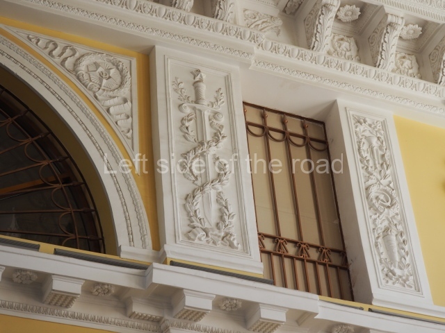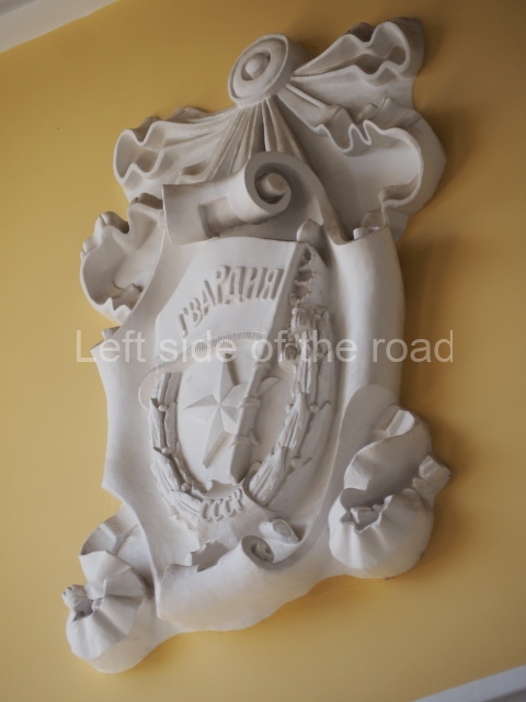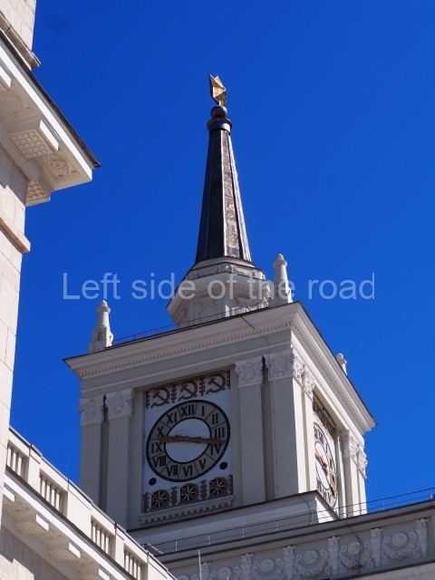 On either side of the main entrance to the station, under the tower and clock, are bas reliefs that depict, on the left, a representation of the Civil War and on the right the Siege of Stalingrad in the Great Patriotic War. Note the Nazi standard being trampled underfoot in the second bas relief.