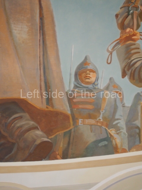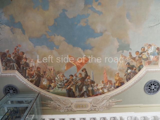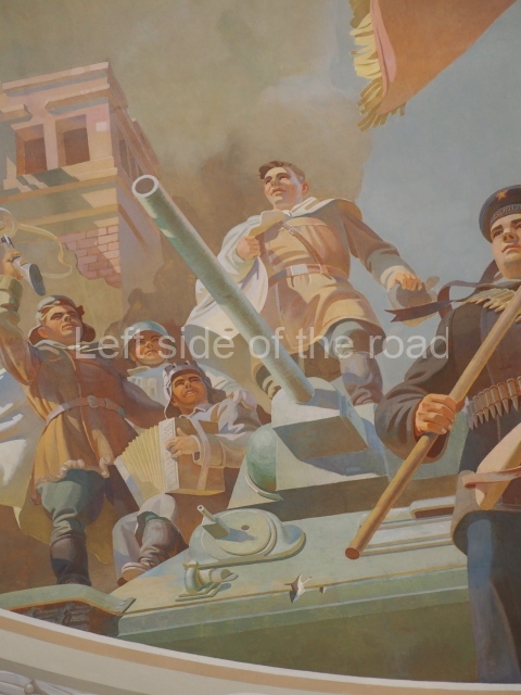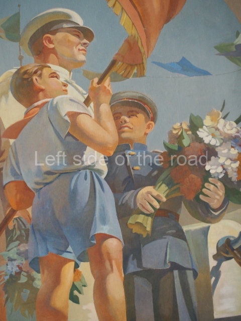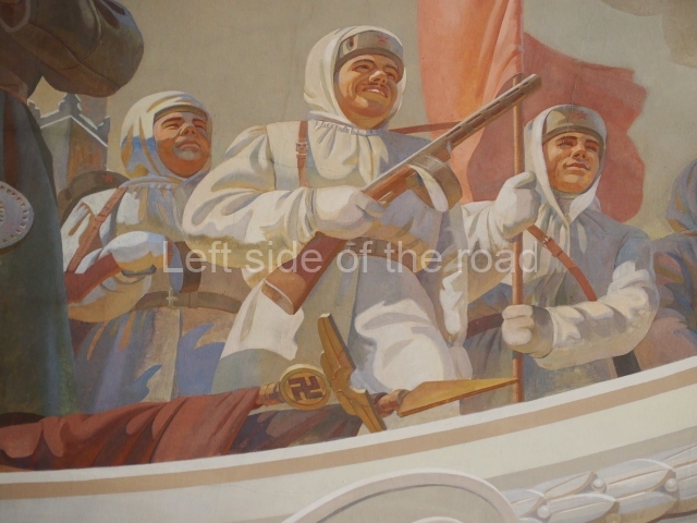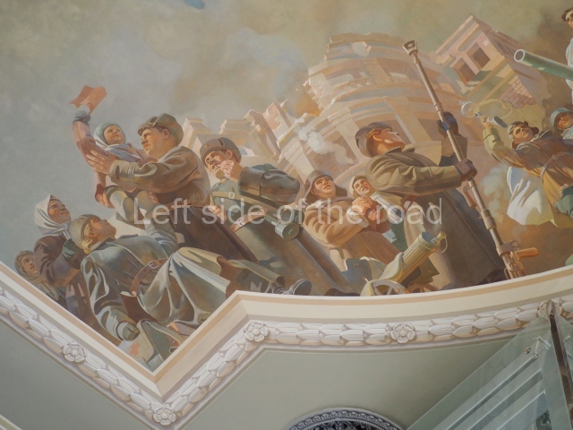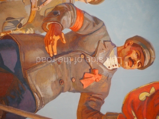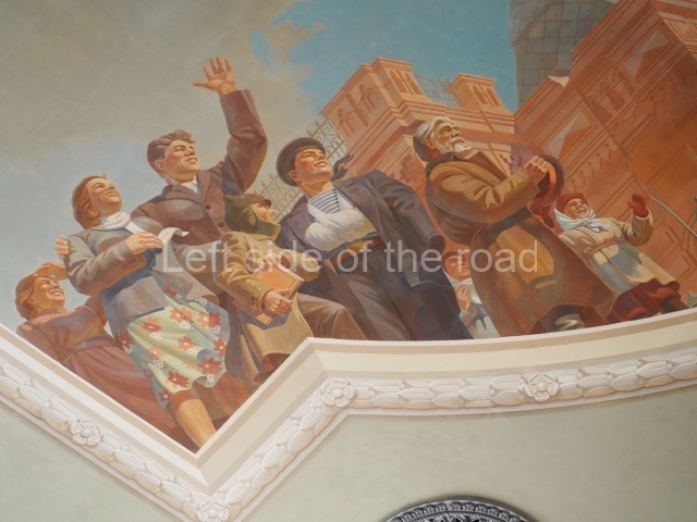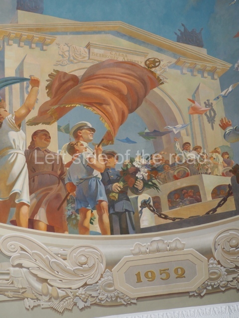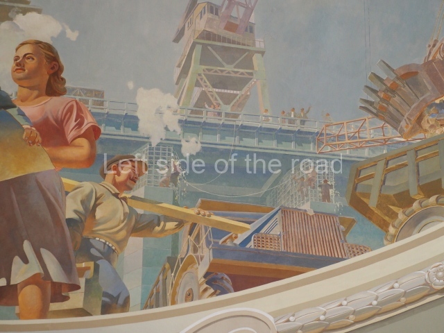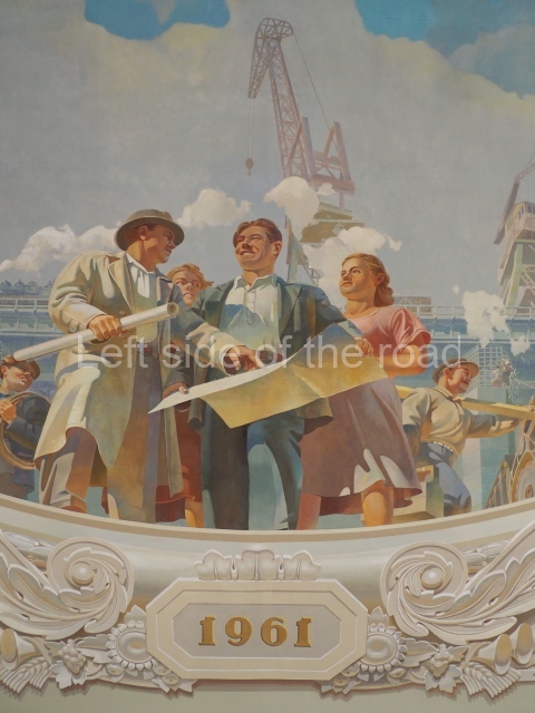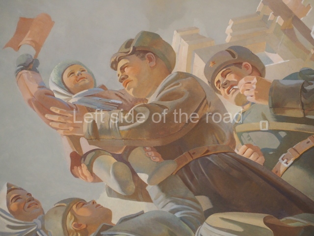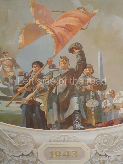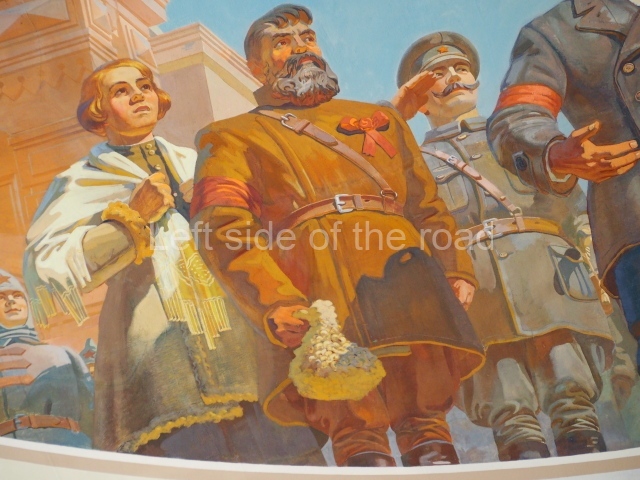 Note the trees that are on the left and right of each panel, which play the role of separating the two events. In 1918 there is barely a leaf on the tree, there are more come 1943 but when we go into the 1950s and 60s we see the tree come into full leaf, mirroring the successes of the construction of Socialism.