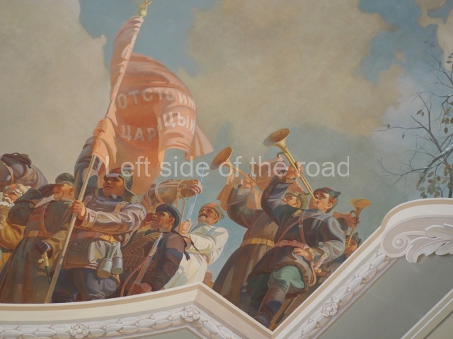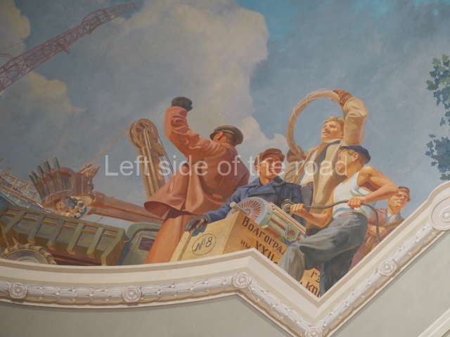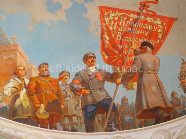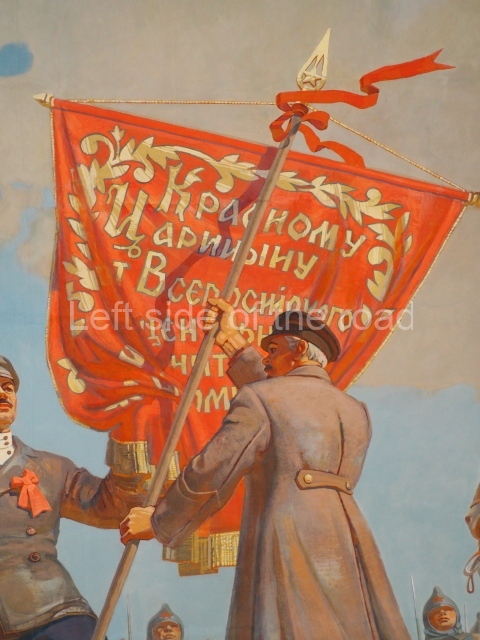 The first circular panel represents Tsaritsyn/Stalingrad in war – or more specifically, at the very end of war. The first depicts an image of the Red Army in the city after the victory over the White (reactionary and supported by the imperialist countries) forces in 1918 when it was known as Tsaritsyn. Opposite, on the same panel is an image of the events following the defeat of the Nazi invaders in 1943 when the city – now named Stalingrad – could commence reconstruction as the Red Army went on to victory in Berlin.