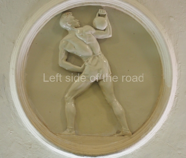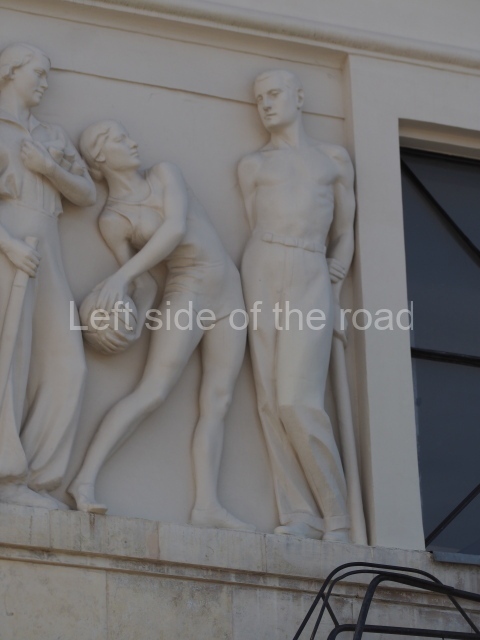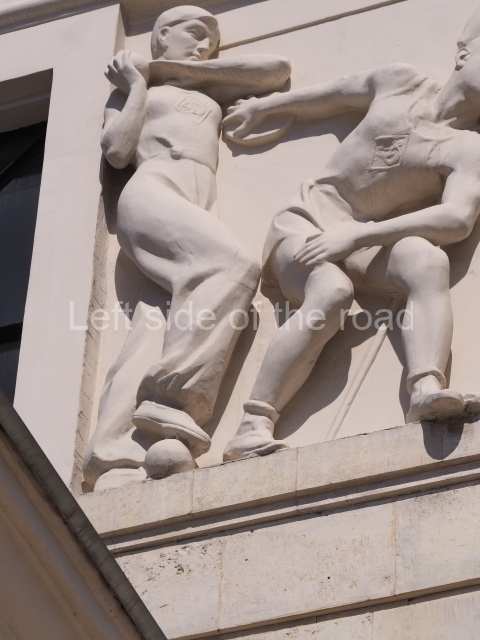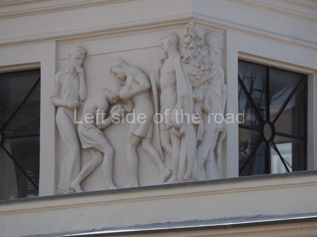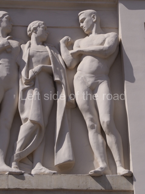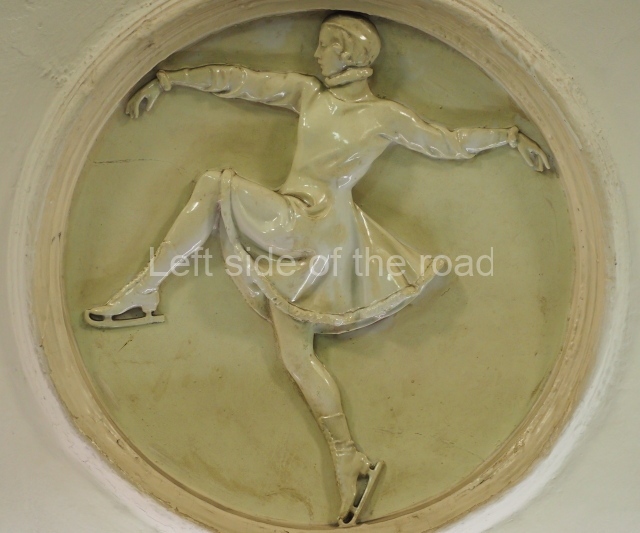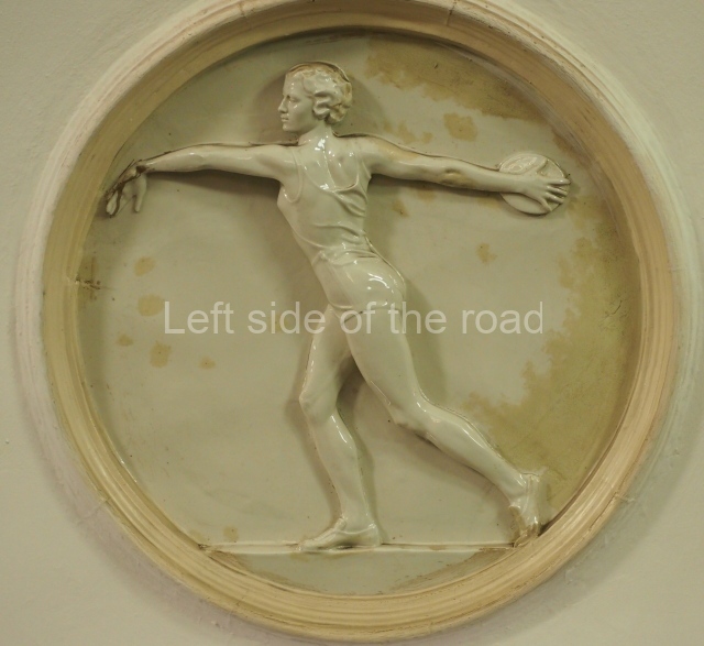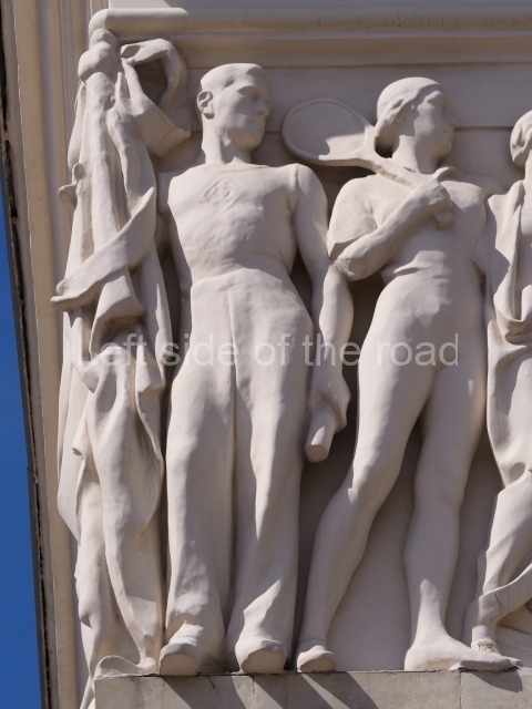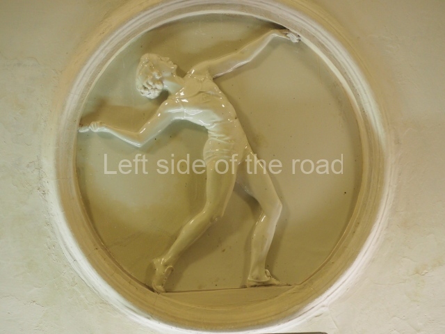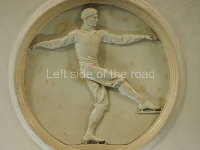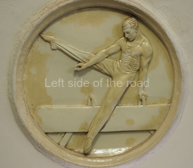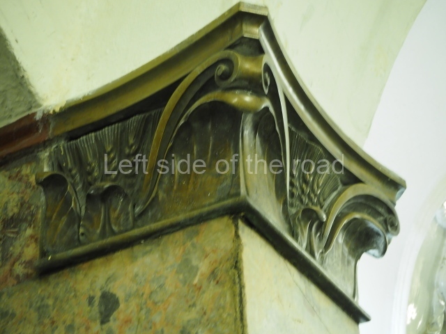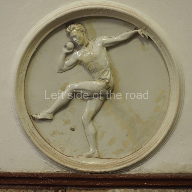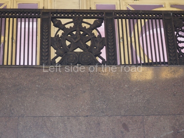 The pylons, faced with red tagilian marble and onyx have porcelain medallions also showing sportsmen. The walls are faced with onyx, white and grey marble, neatly tiled together. The floor is reveted with black marble, although the platforms were initially covered with asphalt.