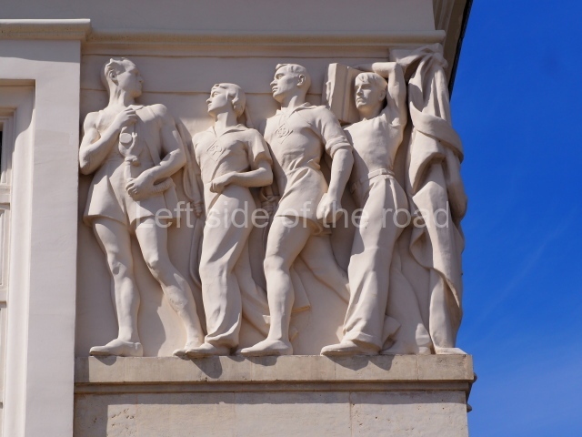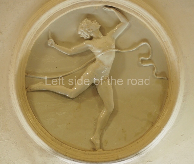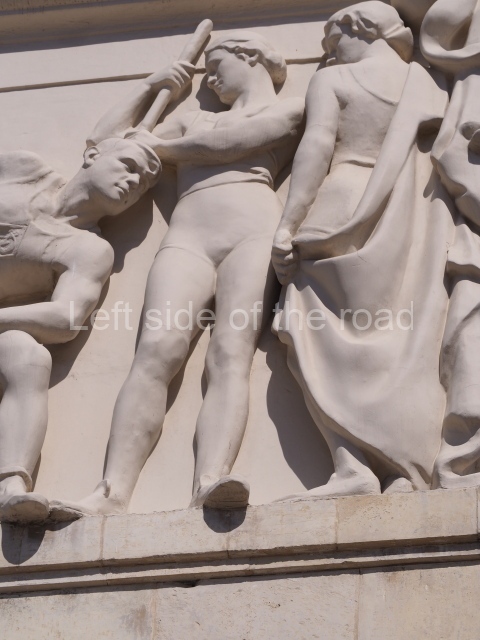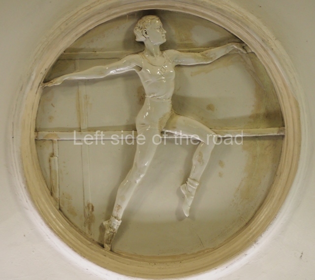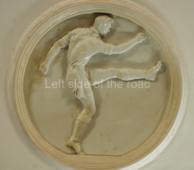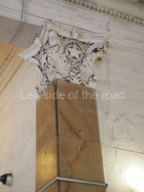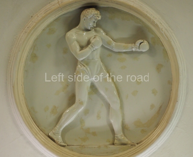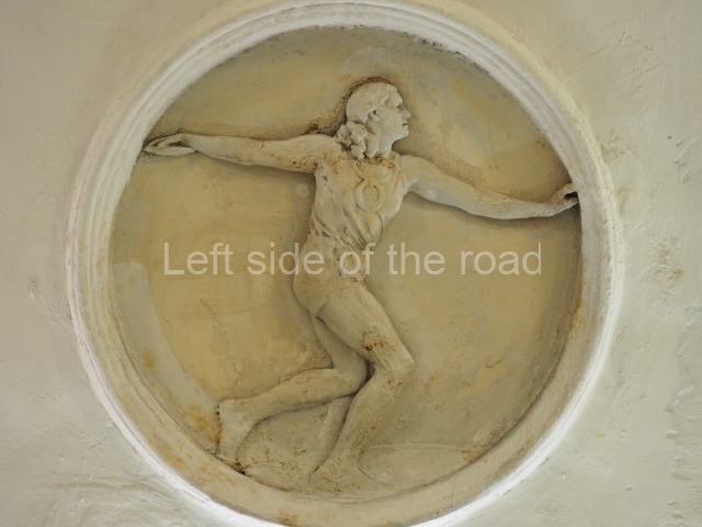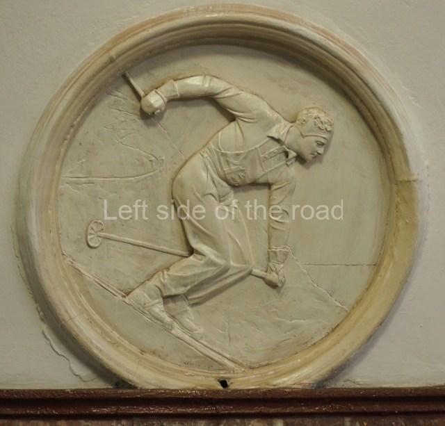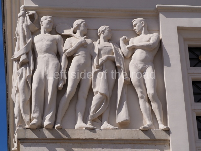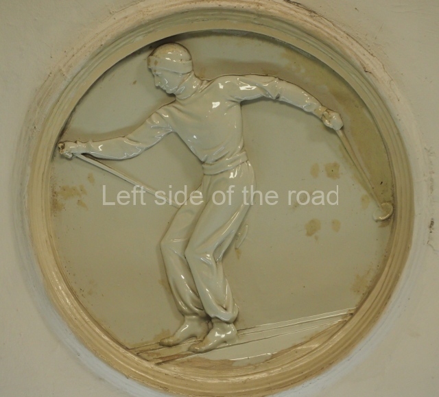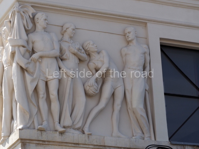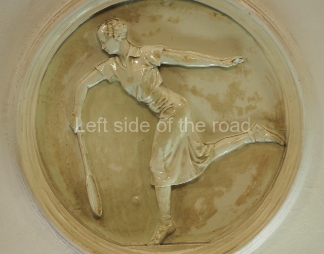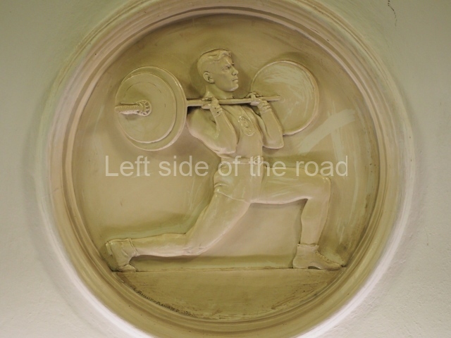 The pylons, faced with red tagilian marble and onyx have porcelain medallions also showing sportsmen. The walls are faced with onyx, white and grey marble, neatly tiled together. The floor is reveted with black marble, although the platforms were initially covered with asphalt.