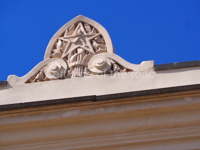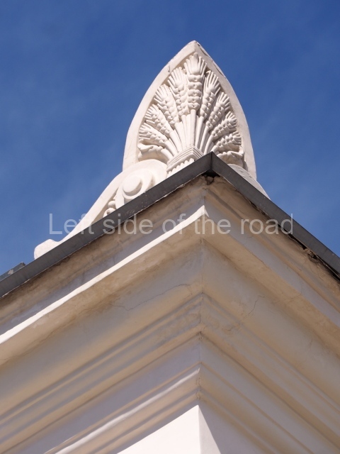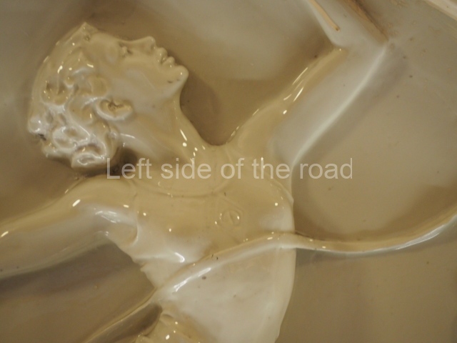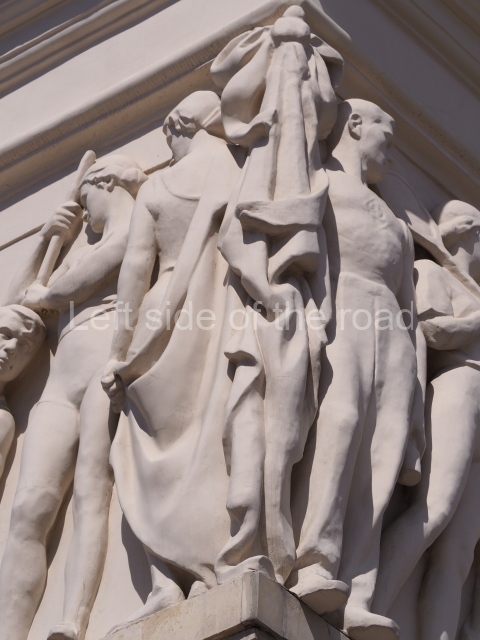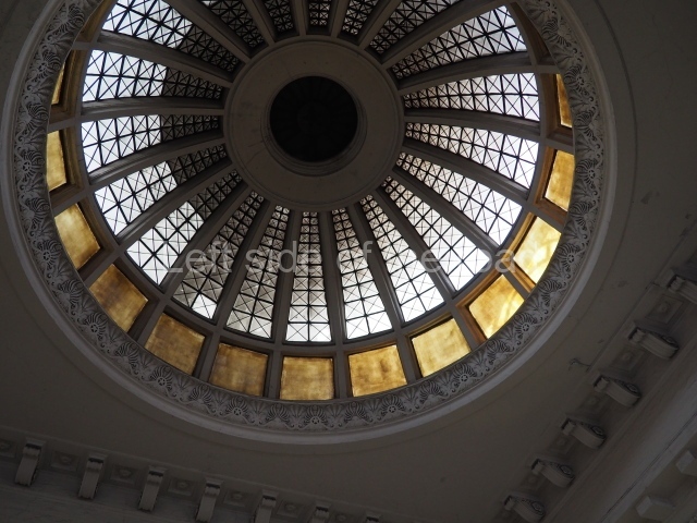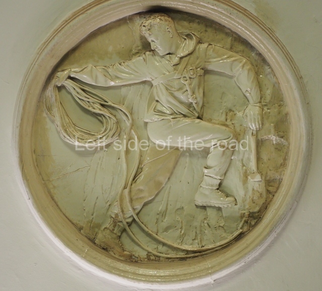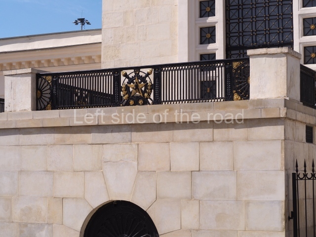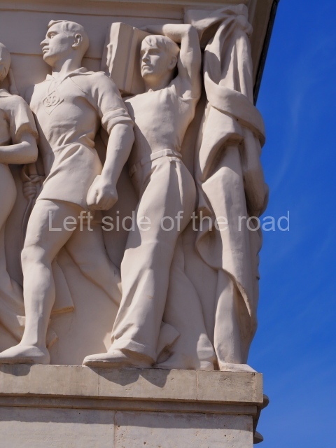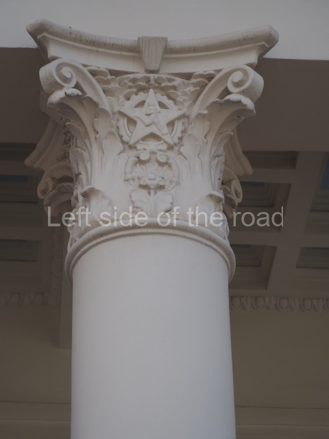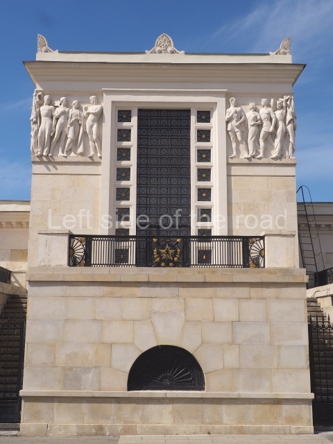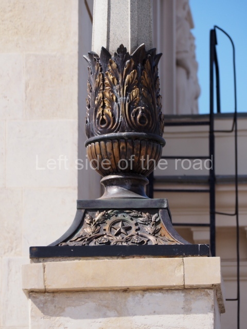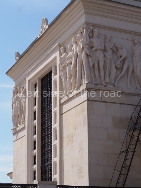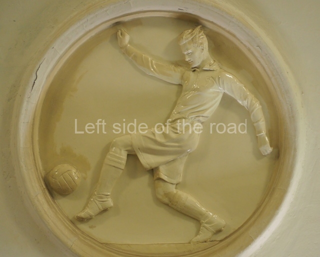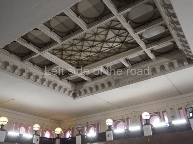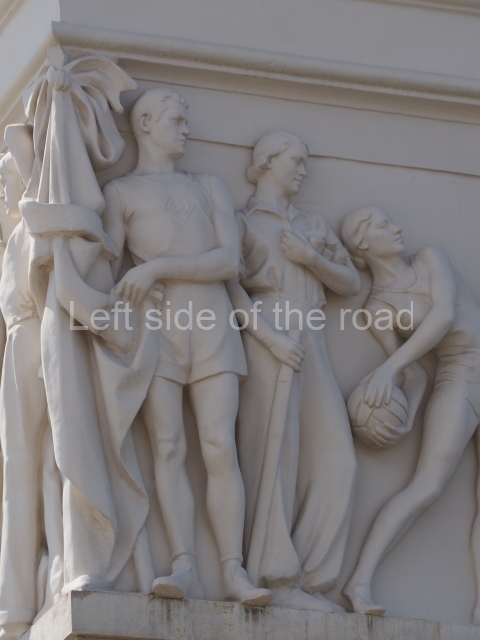 The pylons, faced with red tagilian marble and onyx have porcelain medallions also showing sportsmen. The walls are faced with onyx, white and grey marble, neatly tiled together. The floor is reveted with black marble, although the platforms were initially covered with asphalt.