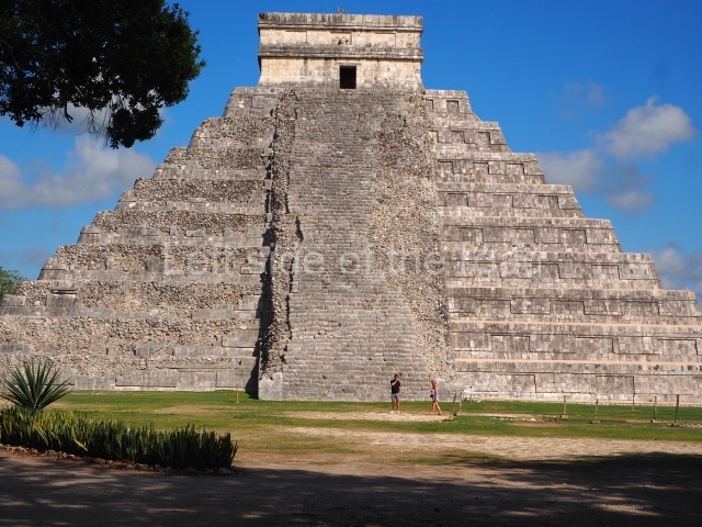 Also known as the Temple of Kukulcan, this is the largest construction at Chichén Itzá, built on a square platform overlooking the city. Together with the Platform of Venus and Sacbe I, it represented the political and religious power in the ancient city. It displays an austere decorative programme, based on the giant plumed serpents on the balustrades. Situated inside it is another temple from an earlier period, facing the same direction which contains a Chac Mool figure and a jaguar-shaped throne with all the original polychromy and inlaid jade.