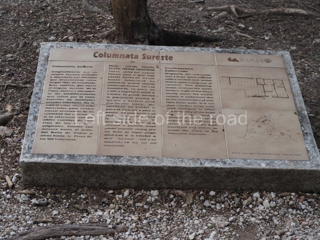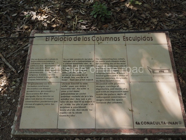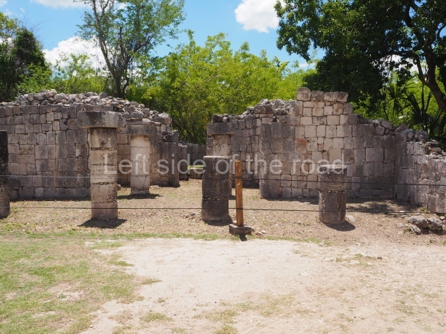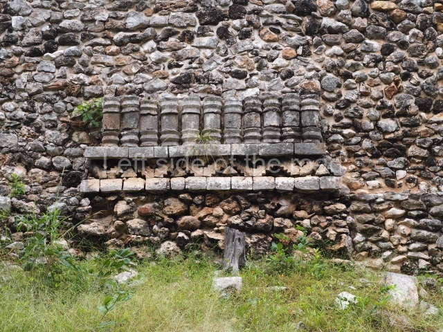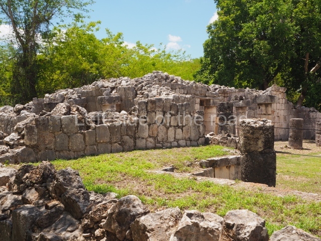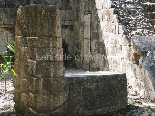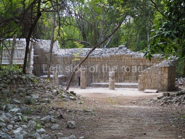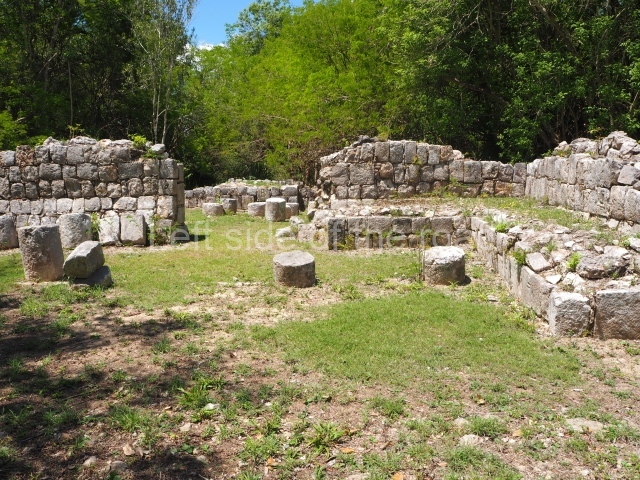 This building comprises five bays and adjoins the east side of the Palace of Balam Kauil Ahau. It is characterised by the pillars that support the vaulted ceilings and the altar in the middle decorated with ritual scenes. Its north platform runs along the side of a deep sinkhole which was clad with stone to contain the rainwater that drained into it from the plaza.