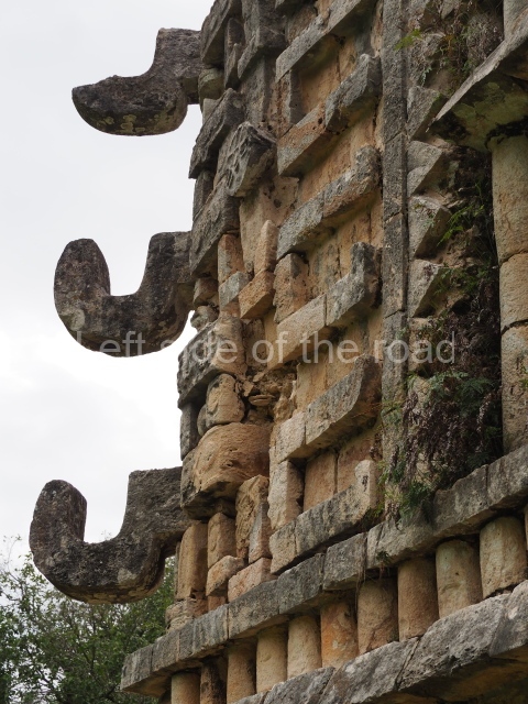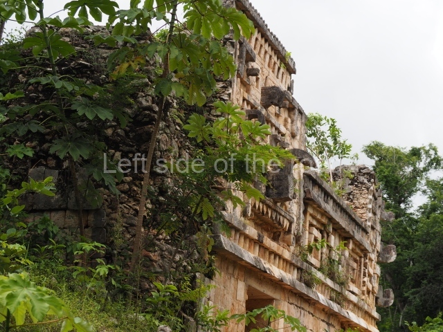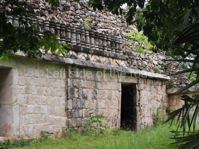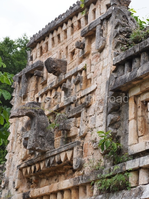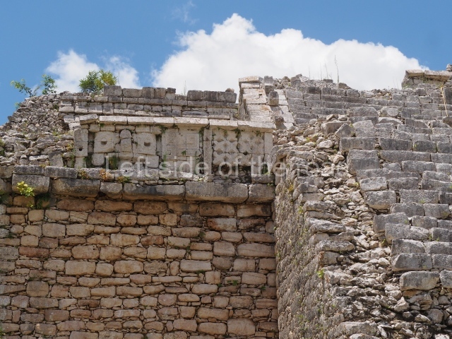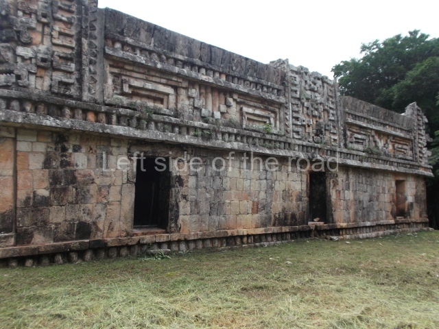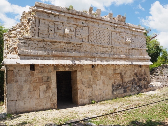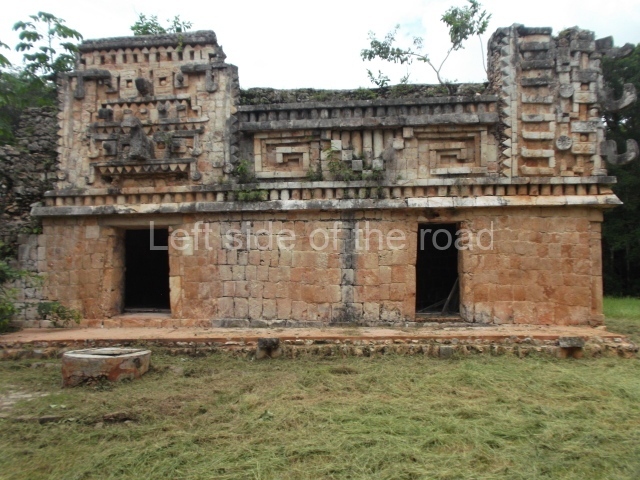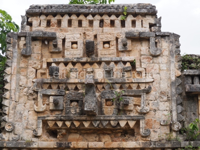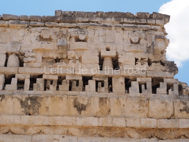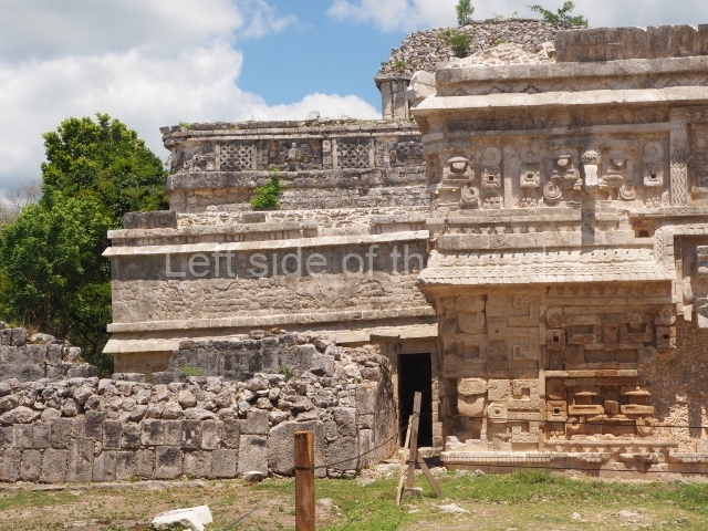 This small building with a single room is thus called because of its proximity to the Nunnery. The upper facade is profusely decorated with long nosed masks and the four bearers of the corners of the sky (pauahtunes); the central mask incorporates an important personage. The function of this building is not known, but it is one of the finest examples of the architecture similar to the Puuc style at the site.