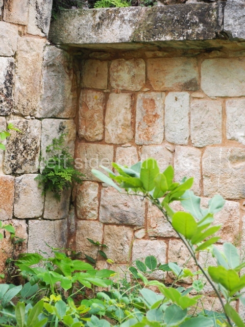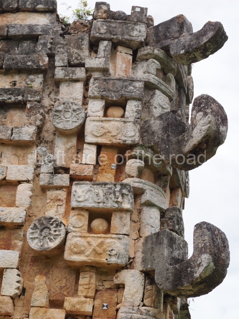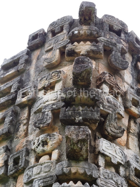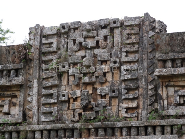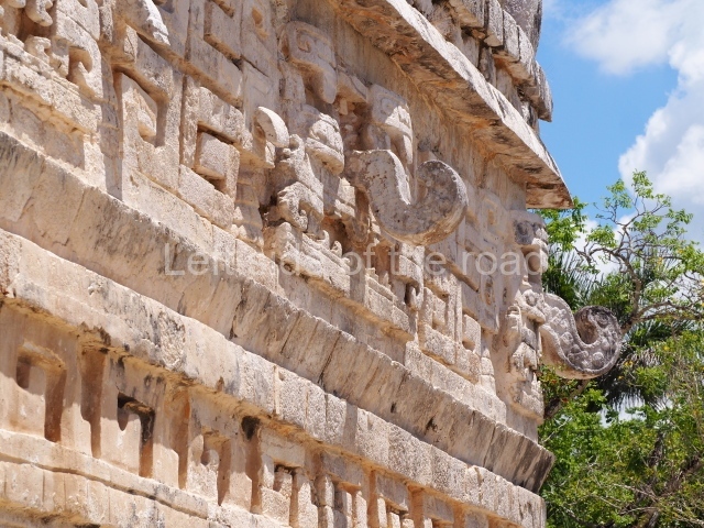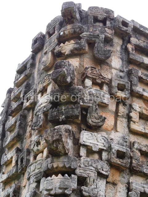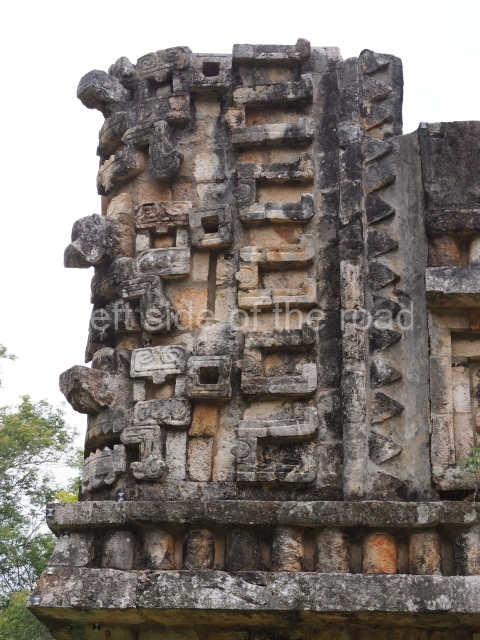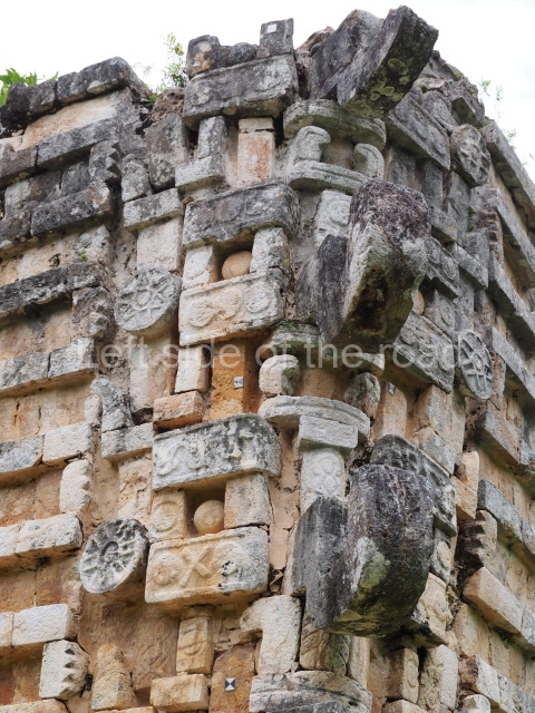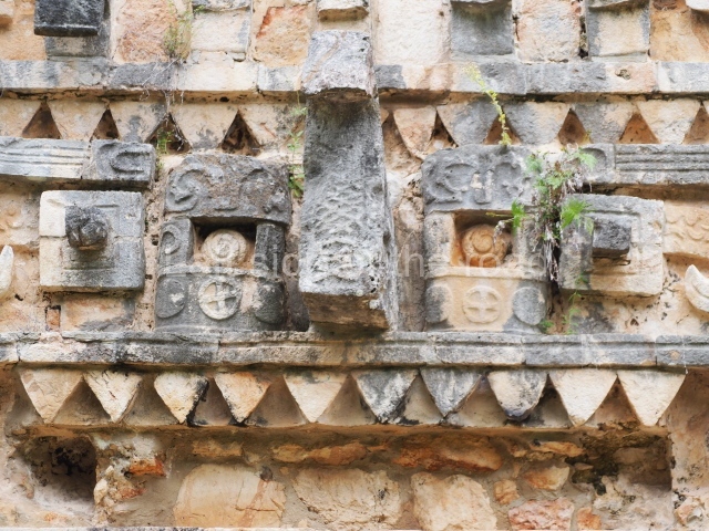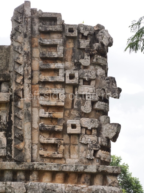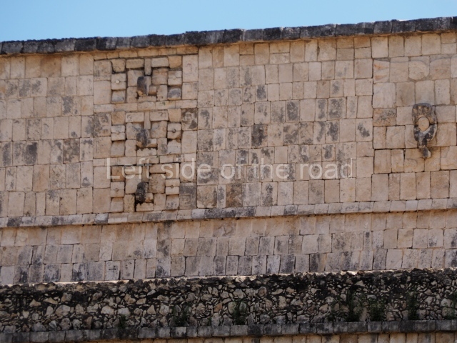 This small building with a single room is thus called because of its proximity to the Nunnery. The upper facade is profusely decorated with long nosed masks and the four bearers of the corners of the sky (pauahtunes); the central mask incorporates an important personage. The function of this building is not known, but it is one of the finest examples of the architecture similar to the Puuc style at the site.