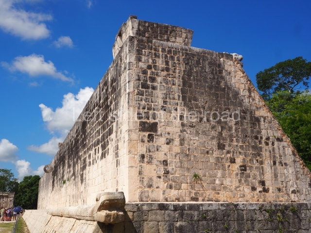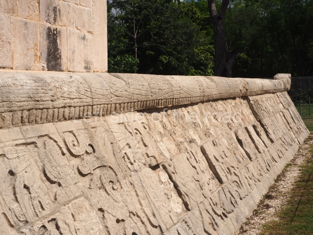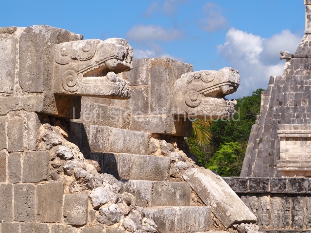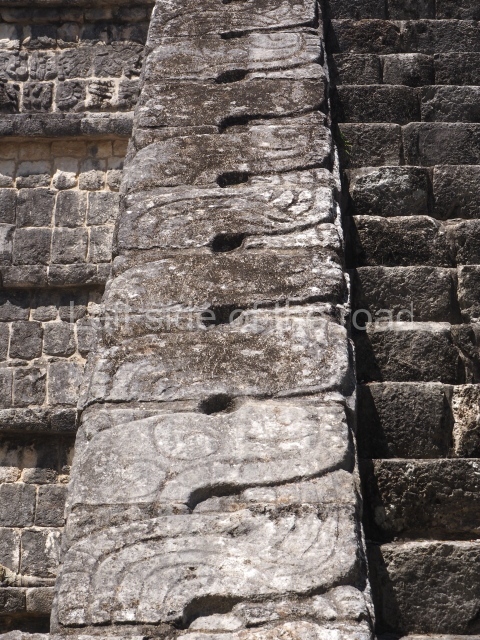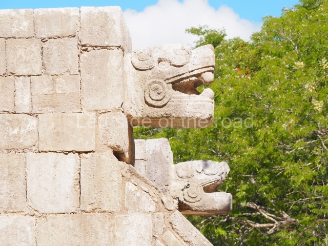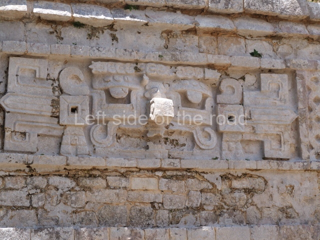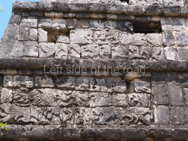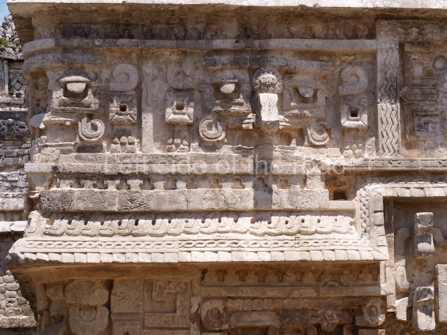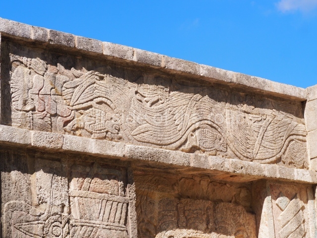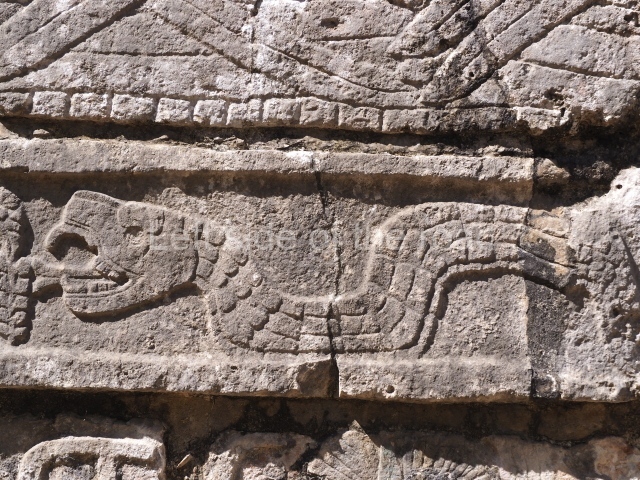 This is quadrangular with stairways on all four sides and balustrades culminating in serpent heads. The decorated tableros display plumed serpents and fish; there are also representations of mythical creatures, a mixture of jaguar, eagle and serpent with human features, which have been interpreted as symbols of god, the planet Venus or Quetzalcoatl/Kukulcan as the star of the morning. Reliefs with the ‘pop’ or mat symbol, related to power, recall the political and ritual role that these buildings played, with ataduras or binder-mouldings referring to calendric aspects. There is a strong similarity with the Castillo and the path leading to the Sacred Cenote; according to Landa, this space was used for dances and theatrical events associated with grand ceremonies.