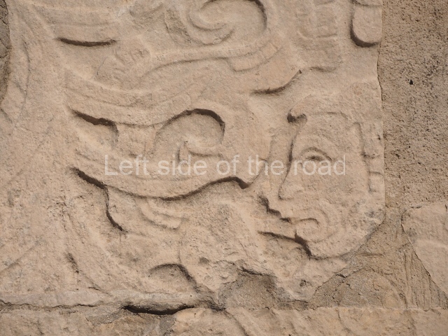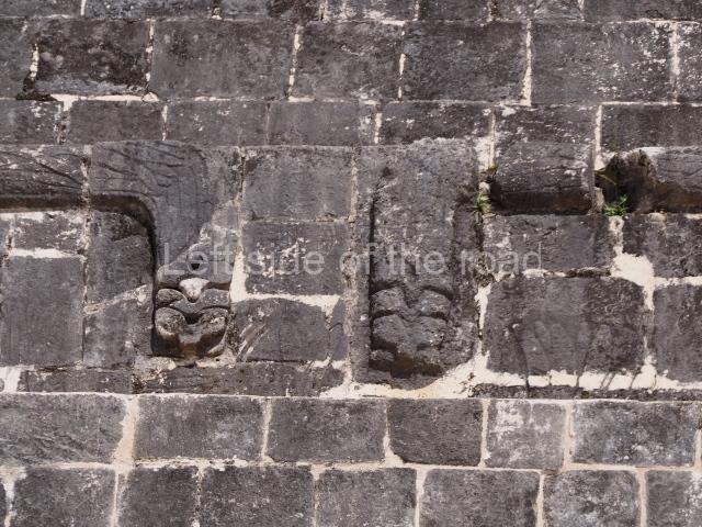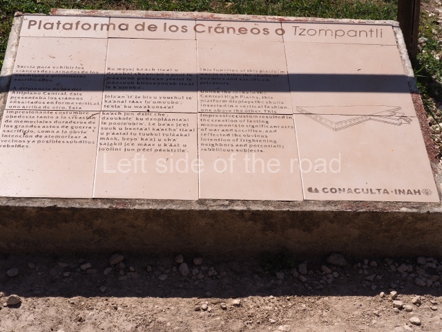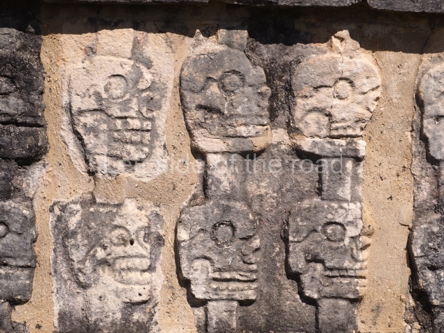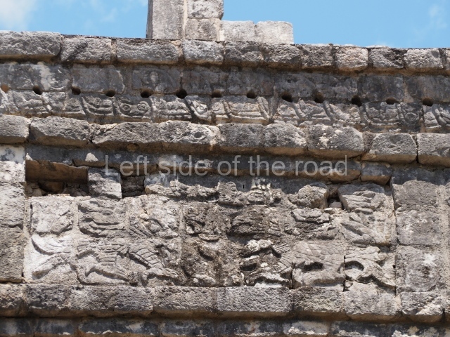 The function of this type of building consisted in exhibiting the bare skulls of sacrificed enemies and prisoners, a ritual that was performed in various parts of Mexico. The skulls here have been strung up vertically, one on top of the other. The purpose of this imposing custom was clearly to immortalise great acts of war and intimidate neighbours and potential rebels. Flanking both sides of the entrance stairway are gaunt warriors leading long processions of other warriors garbed in serpents and carrying human-head trophies. The friezes culminate in two rows of plumed serpents.