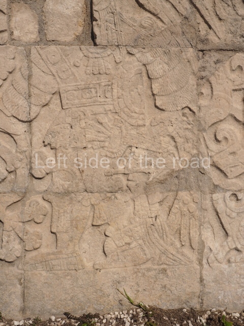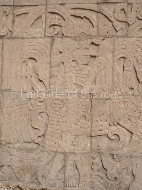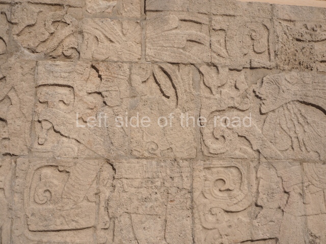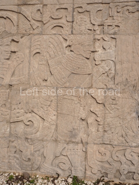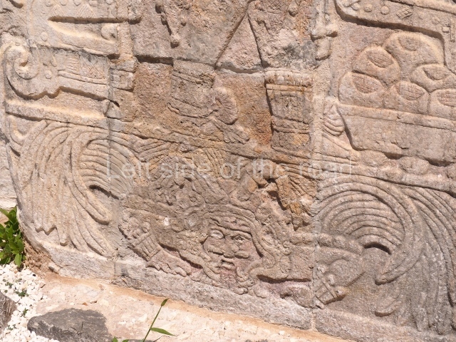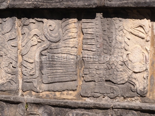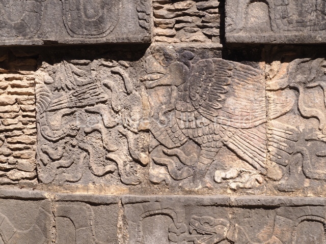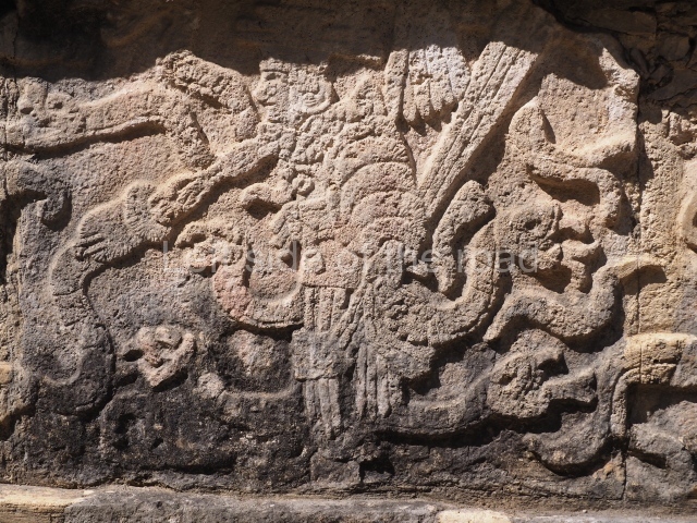 This rectangular platform with four stairways bears a great similarity to the Platform of Venus and other constructions situated on the central axes of the plazas that formed the great city. Plumed serpents climb up the balustrades, while the tableros or panels display recumbent figures and, beneath them, representations of eagles and jaguars holding up what appear to be human hearts.
