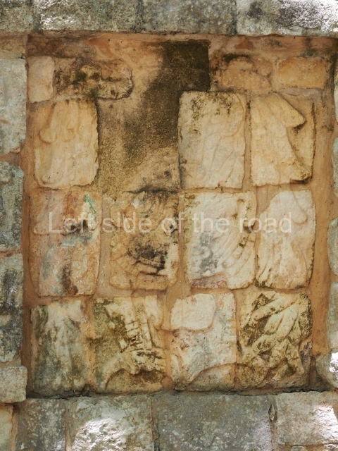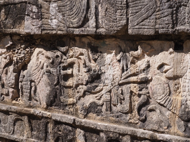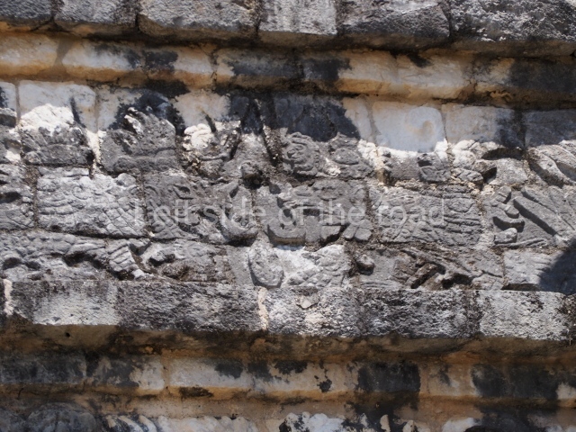 The Venus Platform in the Ossuary Group is similar to that of the Castillo, with a flat surface, four access stairways and reliefs of the man-bird-serpent figure thought to represent Quetzalcoatl or Kukulcan as the star of the morning. Also visible here is the pop symbol of power and the corners are adorned with binder-mouldings alongside the plumed serpent and the symbol of the planet Venus, which appears in its Maya form on the upper panels. Traces of stucco confirm that the reliefs were painted red, green, yellow, blue and black. The skull of a decapitated victim with cervical vertebrae attached was found as an offering at this platform.