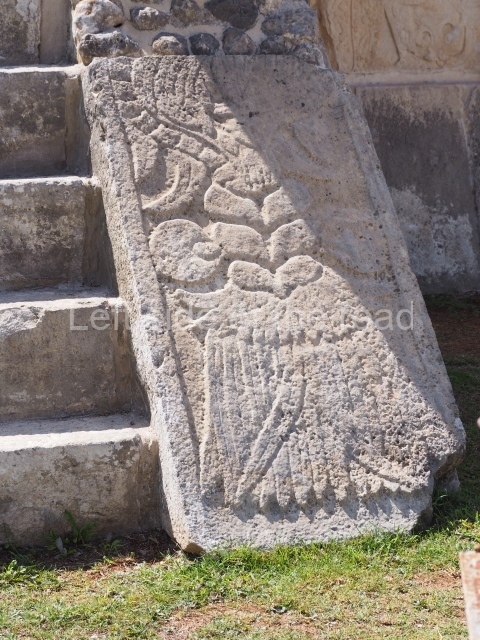 This is a high square-shaped pyramid with four stairways flanked by ascending and descending serpent balustrades culminating in additional serpents covered with symbols, jade and jewels. The platform and upper sections of the building were covered with polychrome stucco reliefs of mythological figures: there are 96 birds with faces of deities and headdresses of human masks facing each other. The panels on the façade of the temple at the top of the platform were adorned with figures of gods or men disguised as the man-bird-serpent and seated figures on sky-blue bands with lots of feathers; the corners are decorated with stacks of long-nosed gods. Situated on the blue paving inside were tables or altars supported by telamons. Semi-kneeling men-birds formed a row across the shrine, which was also full of ceramic incense burners, now broken and abandoned. This temple is particularly important because it is built on a cave to which it is connected by a stone-clad passageway.