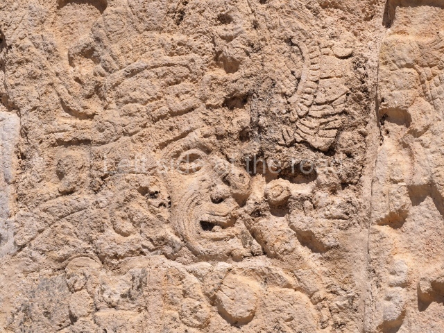 This funerary space is defined by its columns rising from the bedrock to support a perishable roof. The platform culminates in a frieze decorated with intertwining serpents. There was no stairway, and the two burial chambers inside were reused.