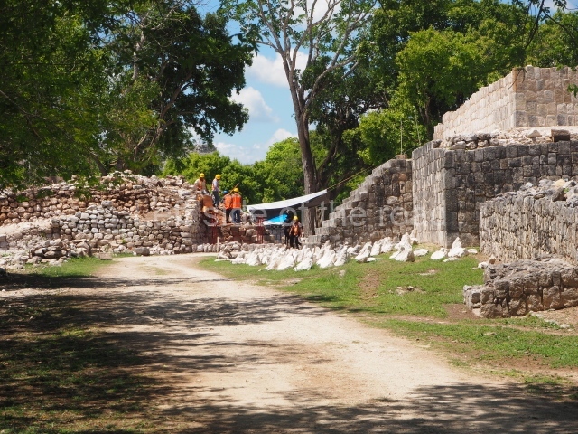 This artificial causeway connects the great Castillo platform to the Sacred Cenote. It is 270 m long and 8 m wide. The sides adopt the form of taludes or slopes clad with veneer stones, and small lateral walls ran along the entire length of the path. The processions would depart from the plaza in front of the Castillo and culminate at the Sacred Cenote, where the ritual cleansing of those to be sacrificed and the officiants would be performed by means of a steam bath. The entrance to this causeway was sealed in times of war by a coarse wall, parts of which have survived to this day.