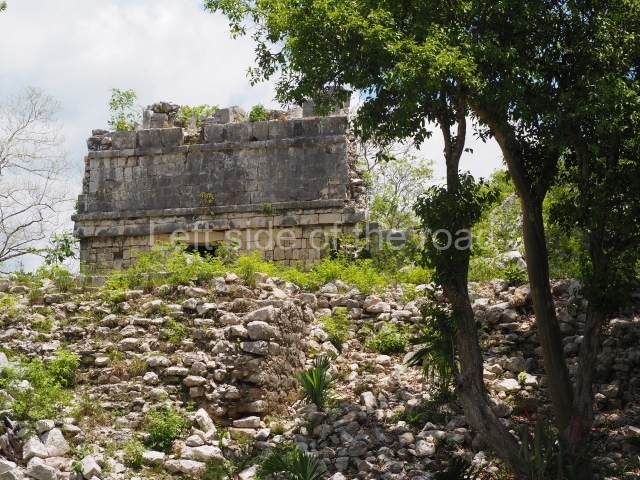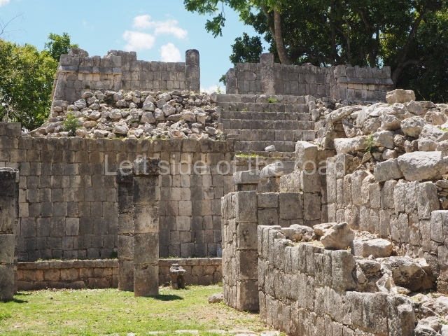This bears certain similarities to the Temple of the Warriors: a wide central stairway leads to two upper rooms with vaulted ceilings supported by pillars with sculpted warriors. Nowadays it has been reduced to a mound covered with rubble.