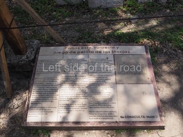 This monumental group lies south of the central platform and contains its own palaces, ball court and a low wall. The main construction, with a temple on the second tier, has rich mural paintings inside and stone mosaics on the outside, in the Late Puuc style. There is evidence of at least six construction phases. The date AD 880 is repeated several times in the long inscriptions on the second tier lintels. At a later date, a small room was added at the top, forming a type of third tier. The jaguar-shaped throne and a stone for human sacrifices visible from the plaza are highly evocative of the ceremonies associated with this building. The courtyards which lie east, north-east and south of the Nunnery have single storey buildings that may have been used as the residence for a dynasty or high-ranking group; there is also a ball court with benches decorated with reliefs. The east facade of the so-called Annexe displays a profusion of long-nosed masks and at the middle a figure seated on a throne of feathers and monster mouth door, distantly recalling the Chenes style in the south-west of the Yucatan Peninsula, from where the Itzá people originated. The inscription refers to a date on the solar calendar and mentions several planets.