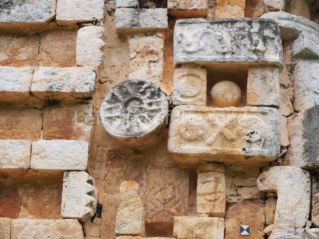 This palatial complex is another structure with several construction phases; it probably began as an elongated building, like those of the Puuc style, and was extended by the addition of numerous rooms around one or two open courtyards. It takes its name from the phallic representations on the walls. A second storey was added to the original building and a gallery defined by pillars with warrior reliefs. There are also two telamons that support a tripartite entrance, above which sits a frieze depicting a personage emerging from a tuber. This central figure is flanked by symbols associated with the origins of the world and descendants, which extend to adjacent building known as the House of the Snails because of a row of these mollusks on the moulding.